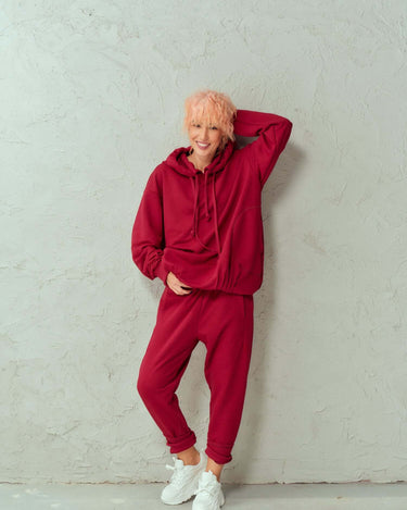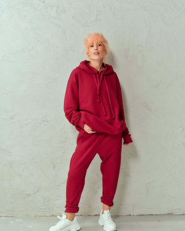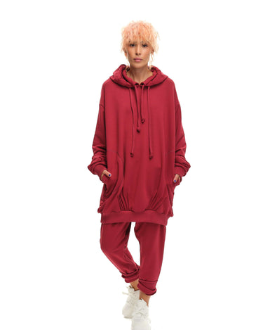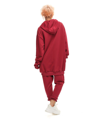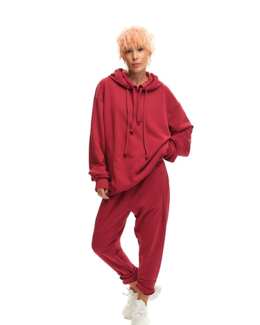 Relaxed double-collared hoodie and track pants with an elastic waist. Both pieces have pockets.