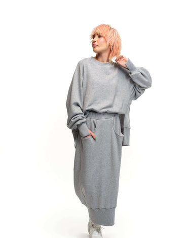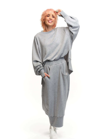 This two-piece set redefines activewear with a thoughtful balance of comfort and style. The top falls effortlessly, while the skirt, anchored by a wide elastic band at the bottom, offers a fresh new silhouette. It’s the kind of ensemble that feels as good as it looks. Style it with crisp white sneakers for a modern take on off-duty elegance.
