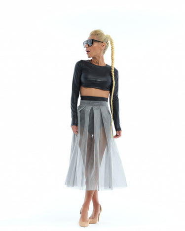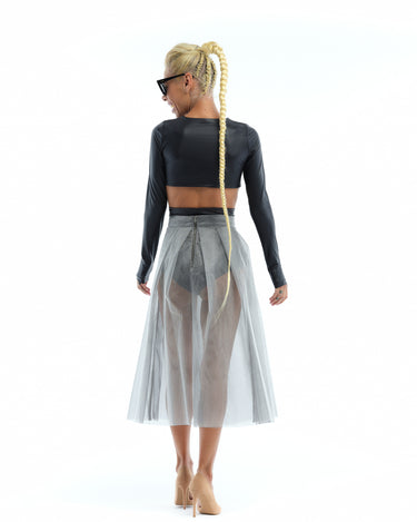 A cropped leatherette top and high-waisted bikini set and a high-waisted sheer maxi skirt with a zipper at the back.
