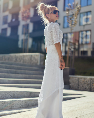 A contemporary all-white set featuring a textured tunic layered over a flowing maxi skirt with an elastic waistband. The tunic’s sheer finish creates a light contrast to the fluid movement of the skirt, making this a statement ensemble that combines minimalism with bold structure.
