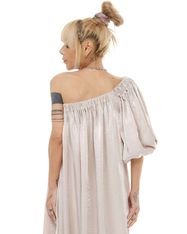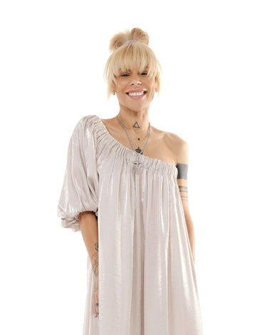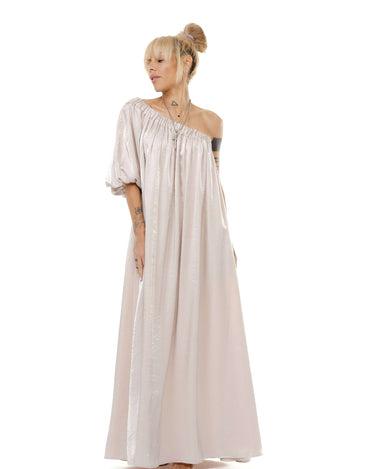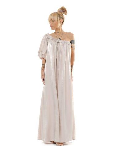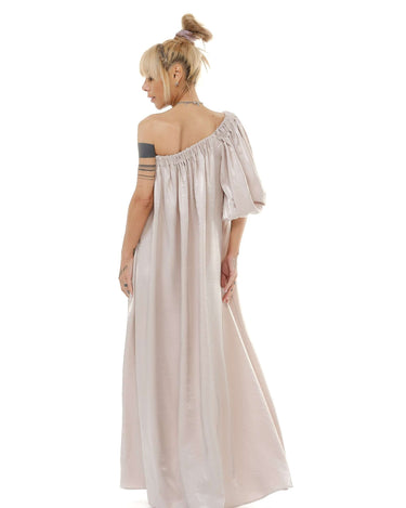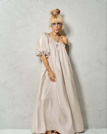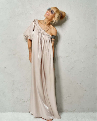 Graceful and striking, this asymmetric beige maxi dress is designed for effortless elegance. Featuring a soft, elasticated neckline that drapes delicately off one shoulder, it offers a relaxed, flowing silhouette with a single voluminous sleeve. Crafted from a breathable blend of 50% cotton and 50% polyester, the fabric has a subtle texture that elevates the minimalist design. Whether you're heading to a summer event or embracing a sophisticated boho vibe, this piece brings comfort and chic together.