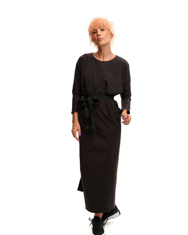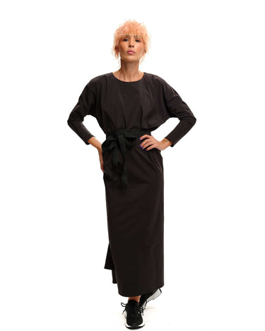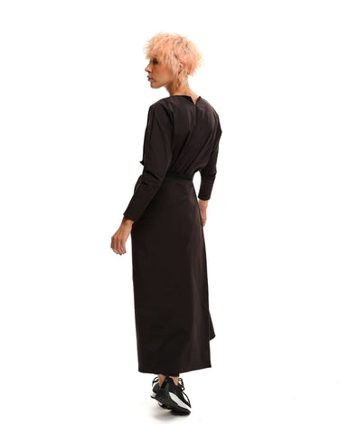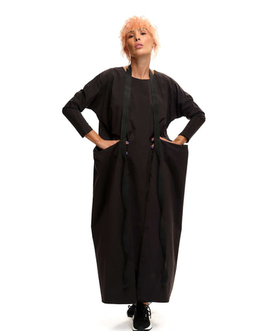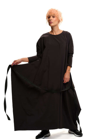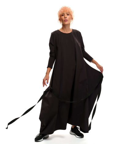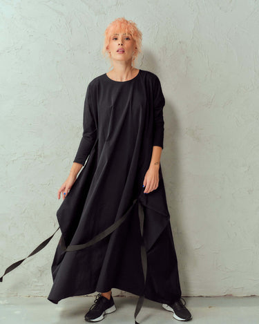 Maxi black dress with an adjustable strap that can be tied in multiple ways. Please note that this piece does not have pockets.