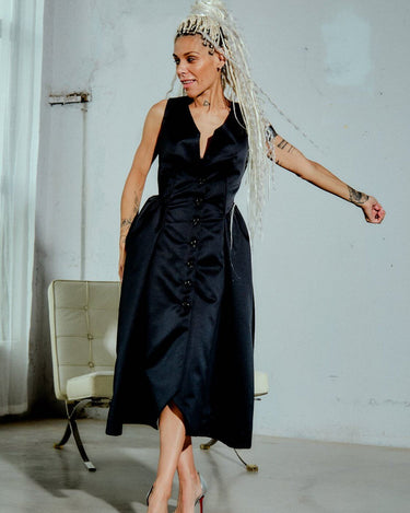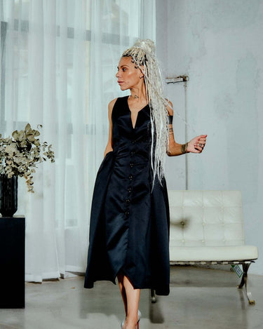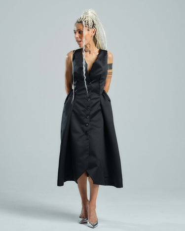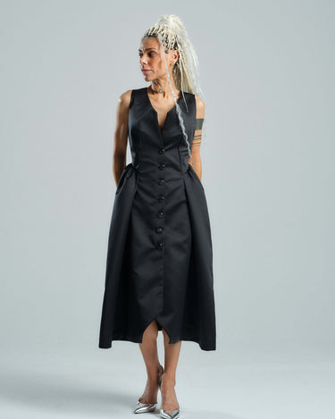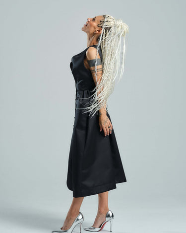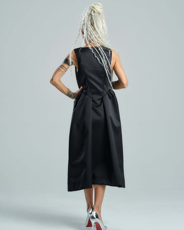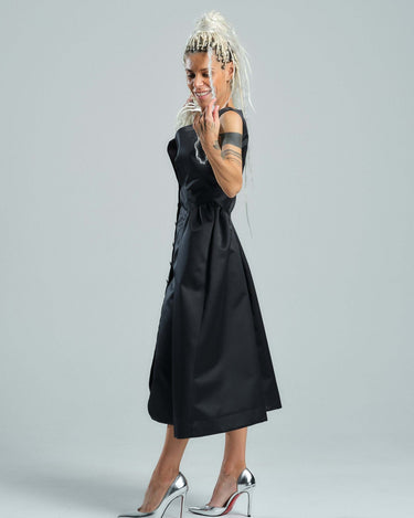 This exquisite dress transforms the chic office silhouette into a sophisticated after-hours look. Notice how the classic workwear cut is elevated by the fabric’s elegant sheen, while billowy waist panels gather at the waist before flaring out in an alluring curve-enhancing silhouette.