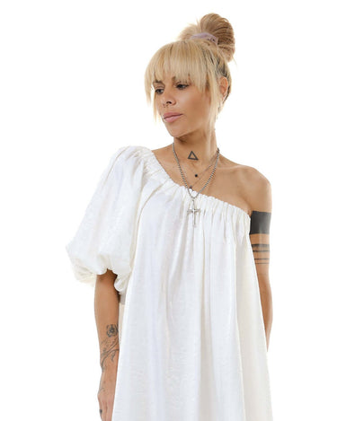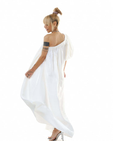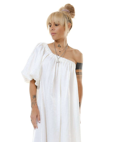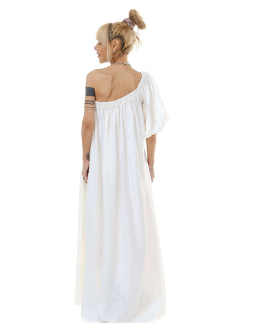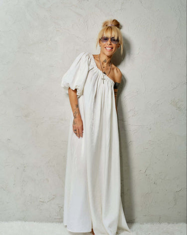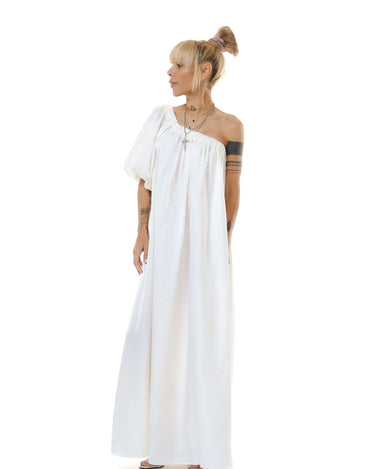 Graceful and striking, this asymmetric white maxi dress is designed for effortless elegance. Featuring a soft, elasticated neckline that drapes delicately off one shoulder, it offers a relaxed, flowing silhouette with a single voluminous sleeve. Crafted from a breathable blend of 50% cotton and 50% polyester, the fabric has a subtle texture that elevates the minimalist design. Whether you're heading to a summer event or embracing a sophisticated boho vibe, this piece brings comfort and chic together.