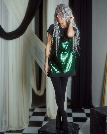 Sleek and sculpted with a bold, high-shine twist, this little black dress is elevated by a shimmering green sequin overlay that cascades across the front, catching the light with every step. Make this piece your go-to for a night out when you want all eyes to be on you.
