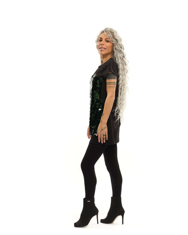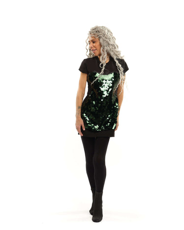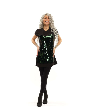 Black short-sleeve dress with a green sequin overlay and a slightly A-line silhouette.