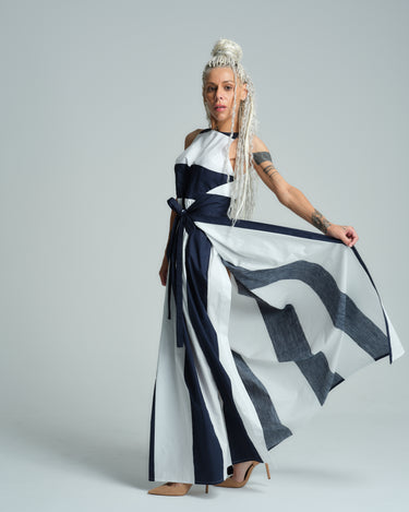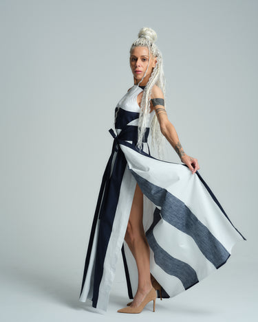 The iconic navy and white color palette and gorgeous waist-cinching silhouette make this dress the perfect vacation statement piece. Allow the stunning pattern to take center stage by pairing it with classic nude pumps.