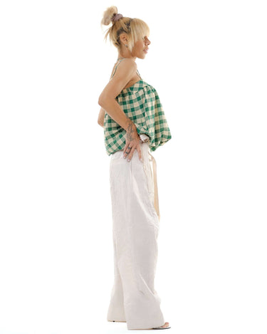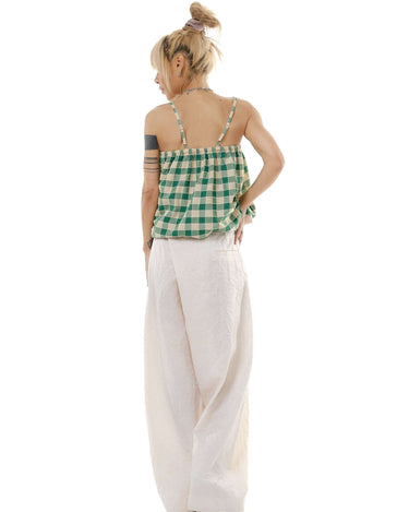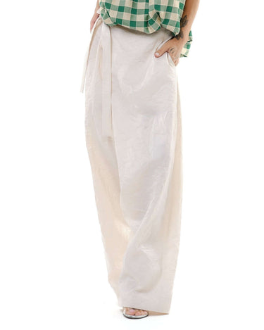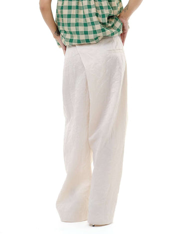 With a subtle crinkle finish and side seam pockets, these pants combine comfort and structure—ideal for warm days, creative workspaces, or relaxed city strolls.