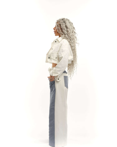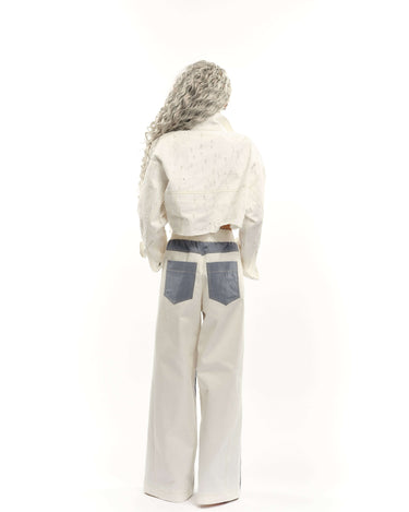 Cropped white denim jacket with distressed detailing and buttoned front.