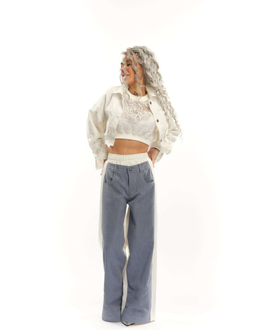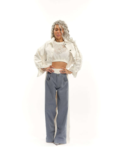 Crisp, structured, and intentionally undone, this cropped jacket reworks a classic with artfully distressed detailing throughout. The sharp cut sits just above the waist, complementing fluid layers or high-rise denim. Designed to add a touch of edge without effort, it’s the piece that defines off-duty cool.