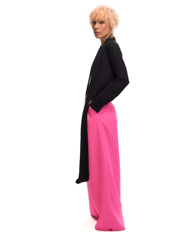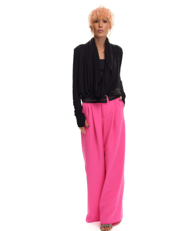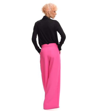 Mid-rise wide-leg pink pants with functional pockets. The waistband can be folded over for a contrasting, waist-defining look.