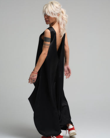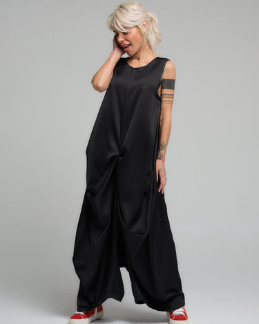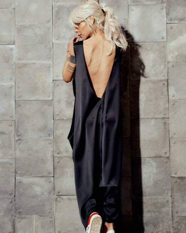 Enhance your everyday style with our sophisticated black jumpsuit. Crafted from smooth polyester, this all-in-one outfit offers a flattering fit with a hint of stretch for comfort. The eye-catching V-back design brings a touch of elegance, making it an ideal choice for a variety of occasions. Pair with sneakers for a casual look or dress it up with heels for an evening out.