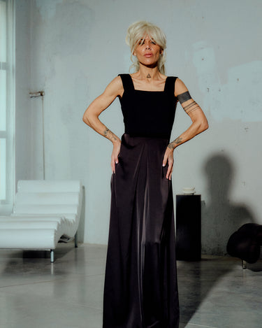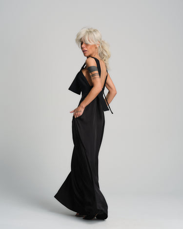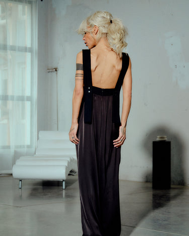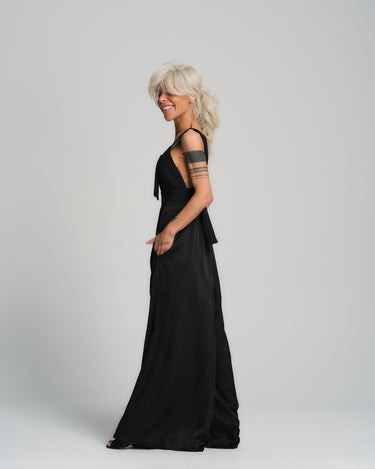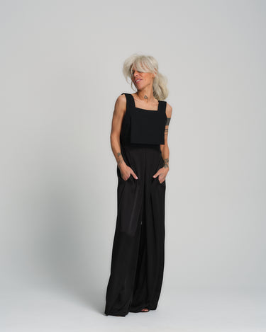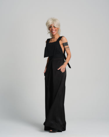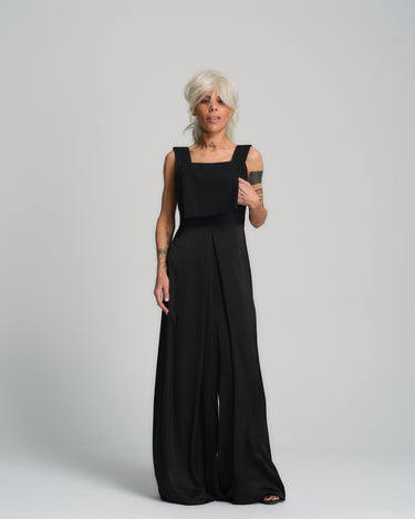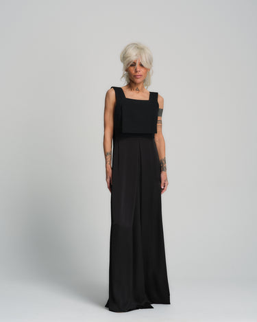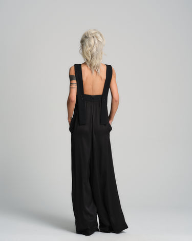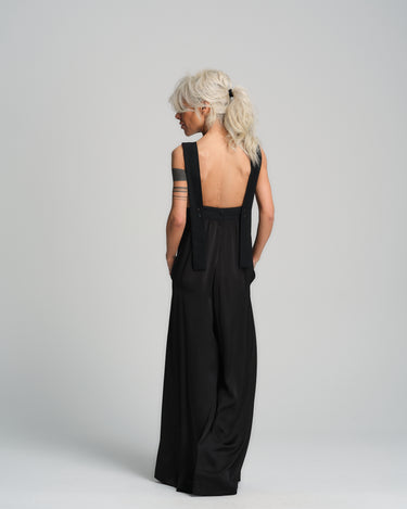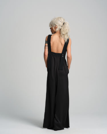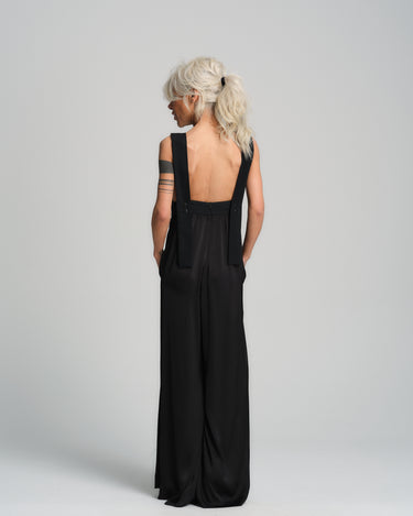A softly structured maxi black jumpsuit. Square neckline with thick straps. Open-back design with a zipper. Functional pockets at the sides.