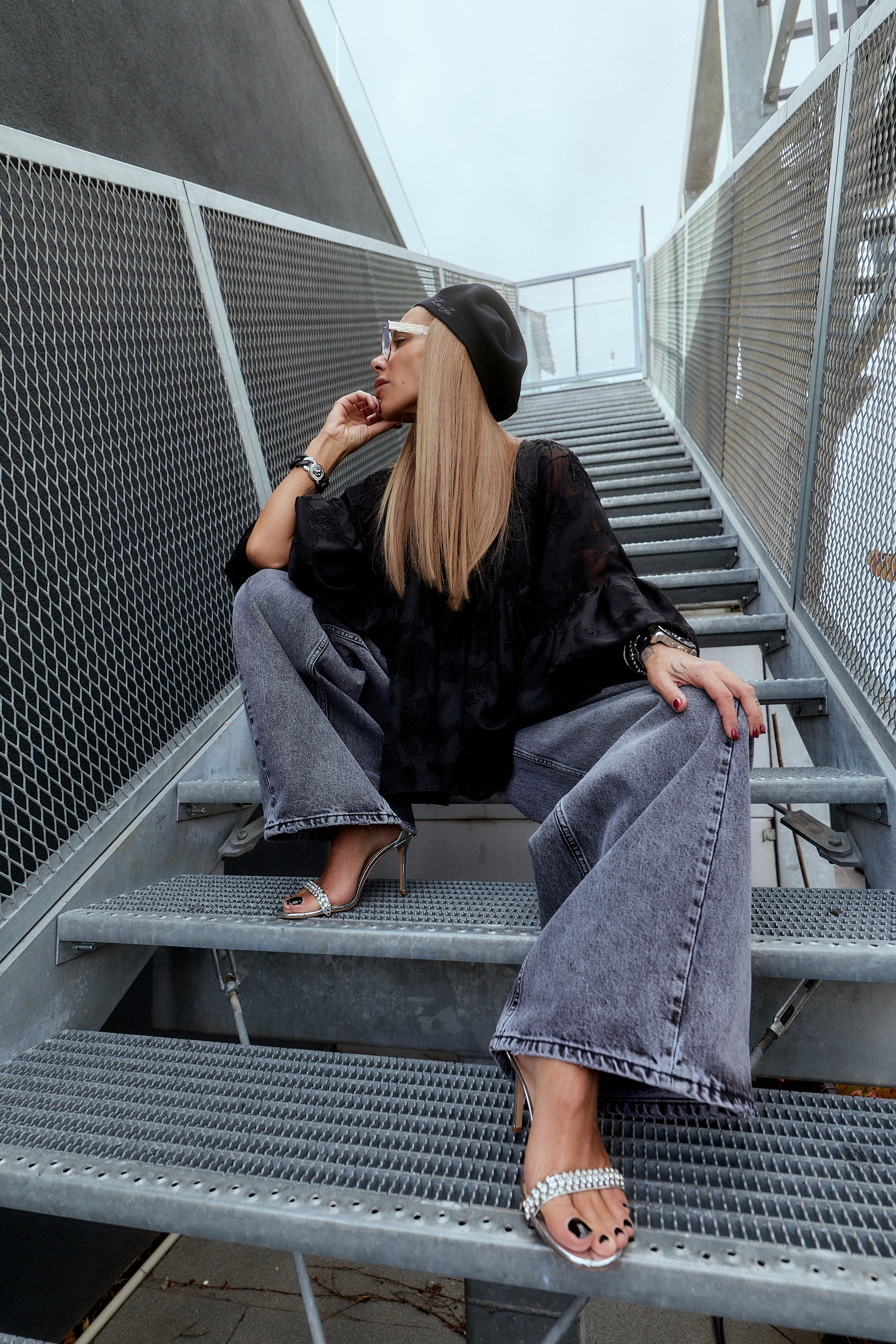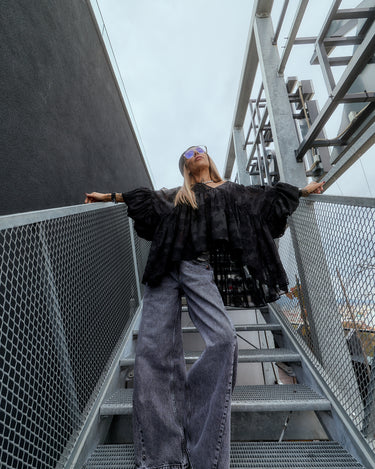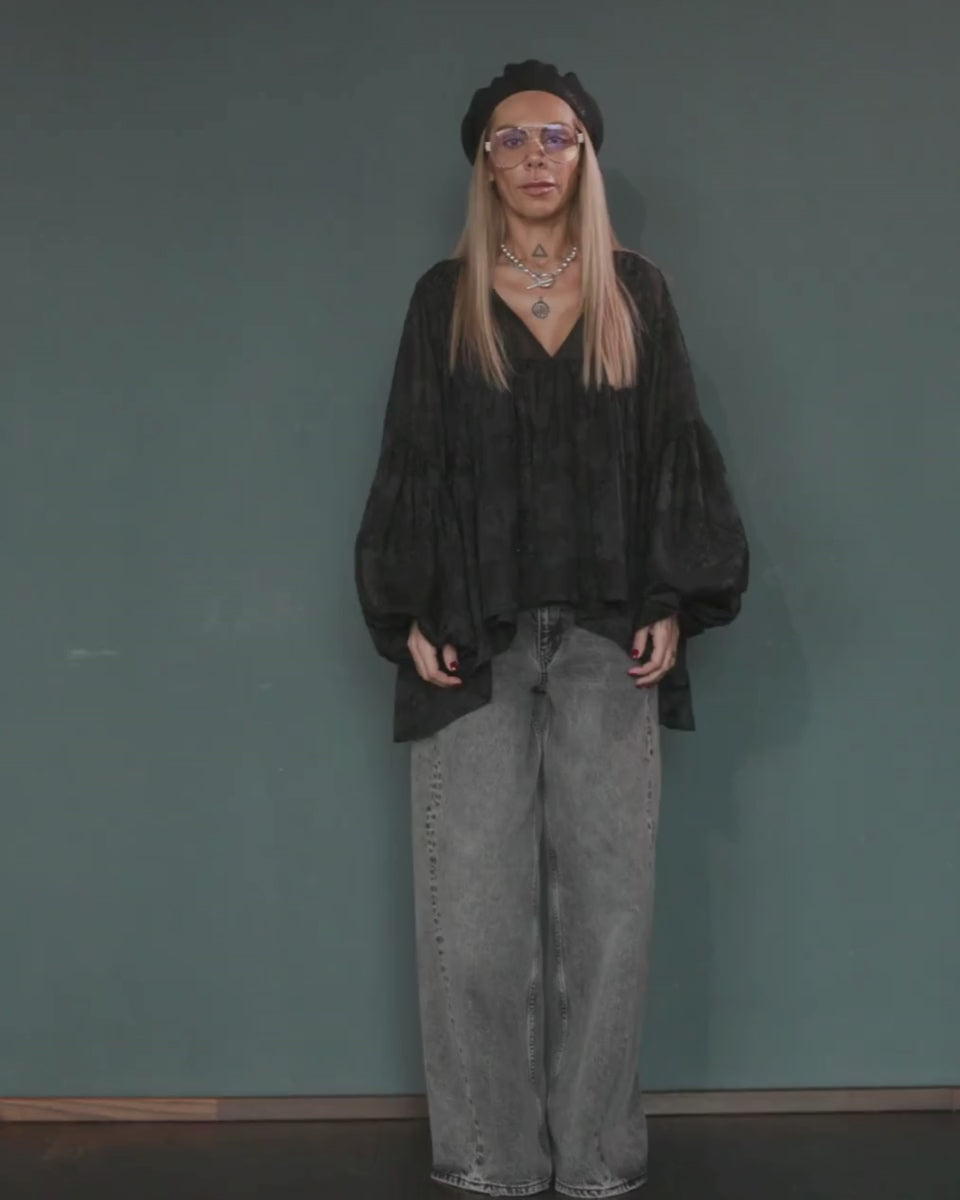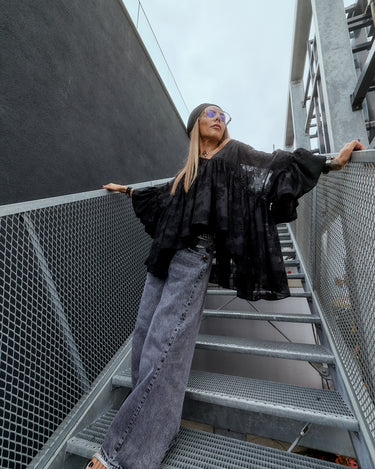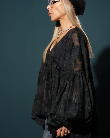 The Black Sheer Tunic is where romance meets edge. Crafted from lightweight sheer fabric with intricate tonal floral embroidery, this piece flows effortlessly while adding structure through its voluminous silhouette. The deep V-neckline and gathered details create soft movement and a statement shape that captures the essence of modern femininity.