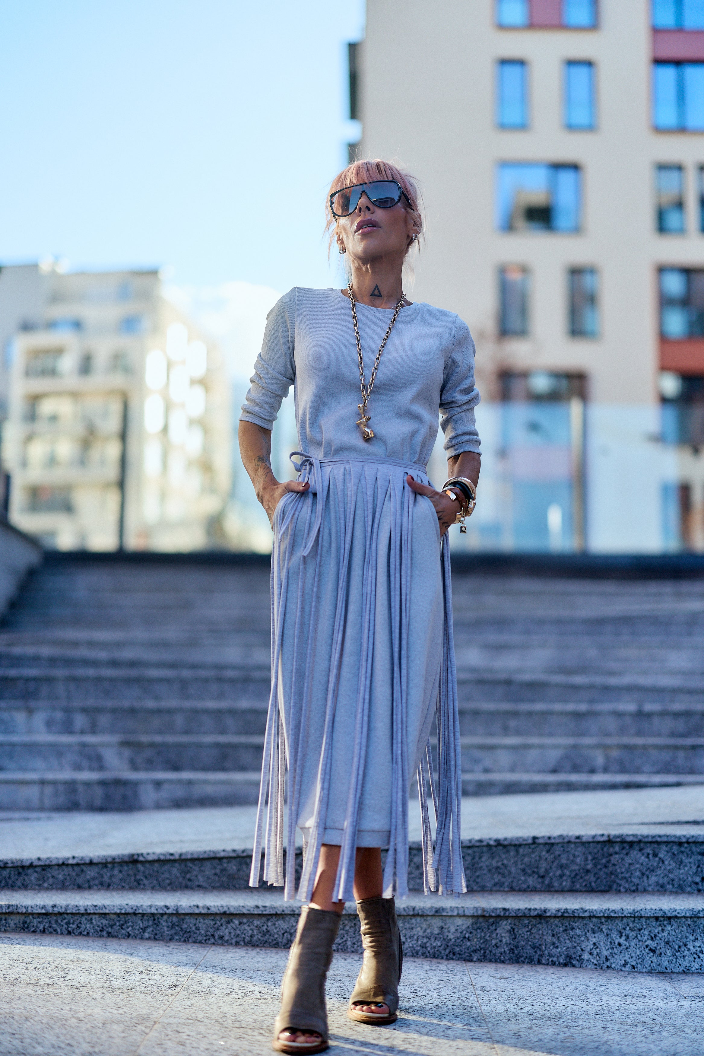 A sculptural, movement-driven dress crafted in a soft grey knit, defined by its dramatic full-length fringe panels. The high-waisted silhouette hugs the body smoothly before releasing into long, fluid strips that sway with every step, creating a striking sense of motion. Discreet in construction but bold in effect, this piece stands at the intersection of comfort and avant-garde design. Finished with side pockets for functionality without compromising the clean line.