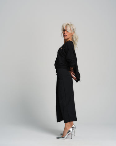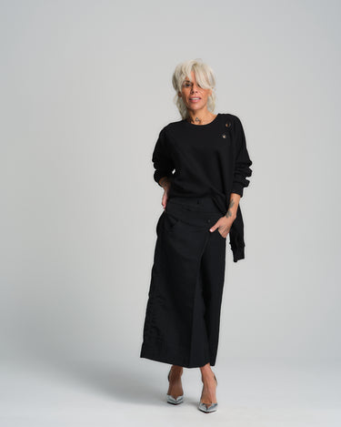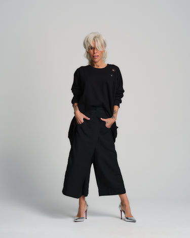 High-waisted wrap wide-leg pants with functional pockets and a button and zipper closure.
