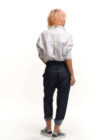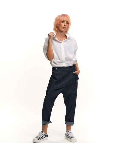 Mid-rise harem jeans with functional pockets and a front flap that can button at the front or back.
