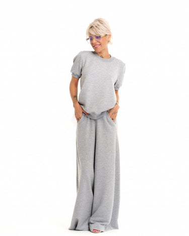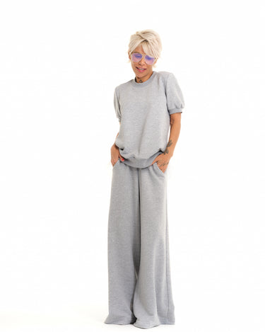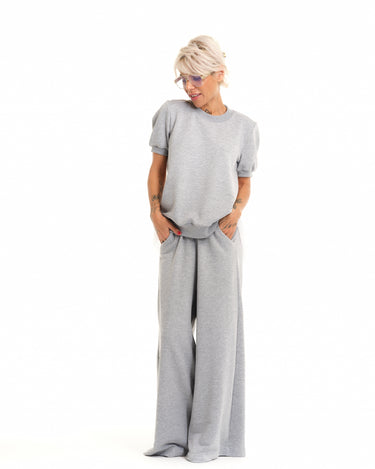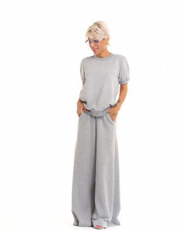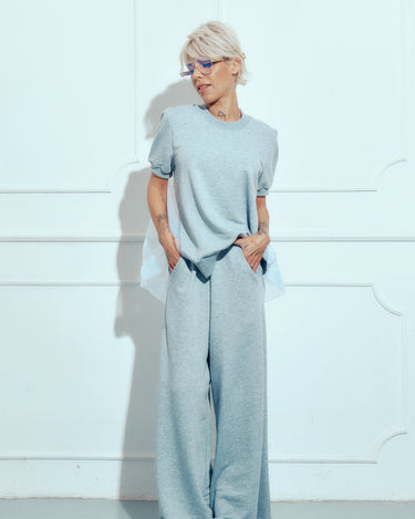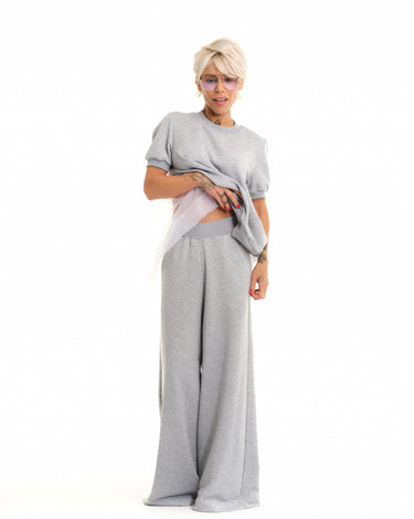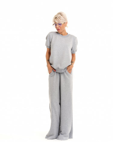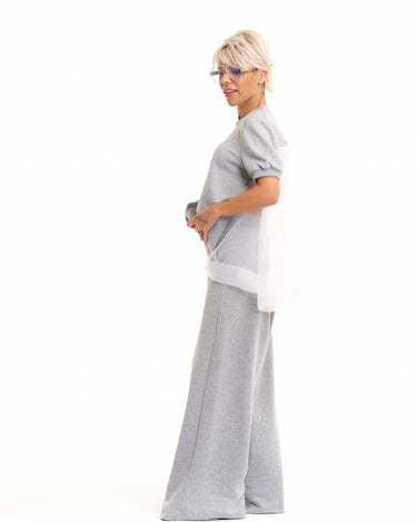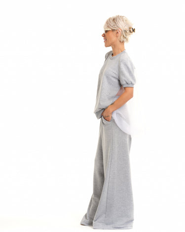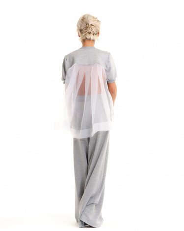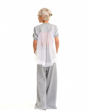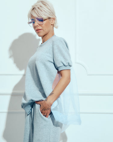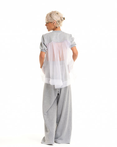 A grey sweatsuit set with a pleated tulle panel at the back. The top has short puff-sleeves. The bottoms have an elastic waistband and functional side pockets.