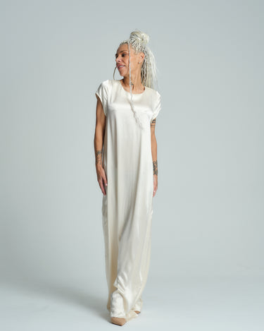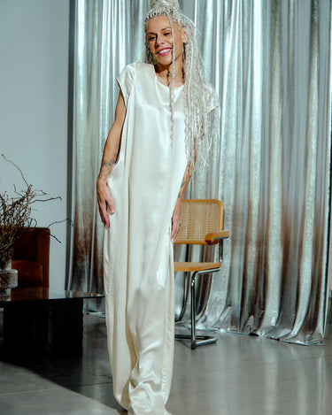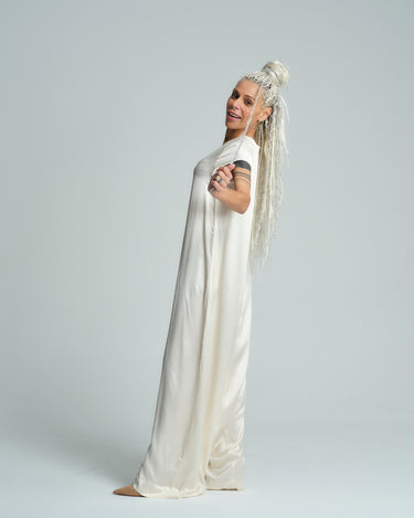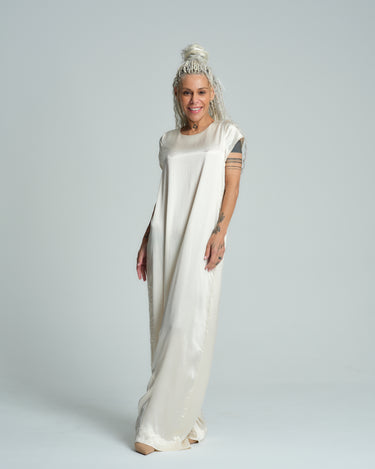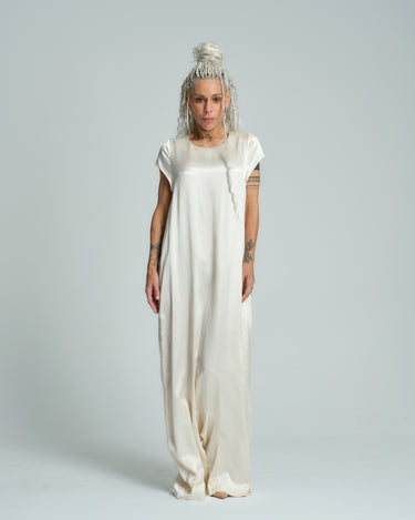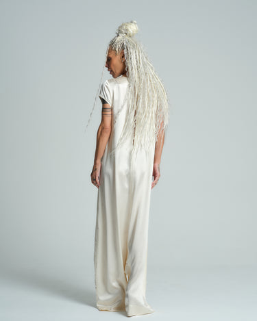 Our satin jumpsuit embodies sleek minimalism with a fluid silhouette that drapes elegantly over the body. Its pristine lines make it a great basic for your summer wardrobe. Complement the floor length by layering longer necklaces and intricate jewelry.