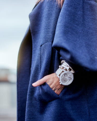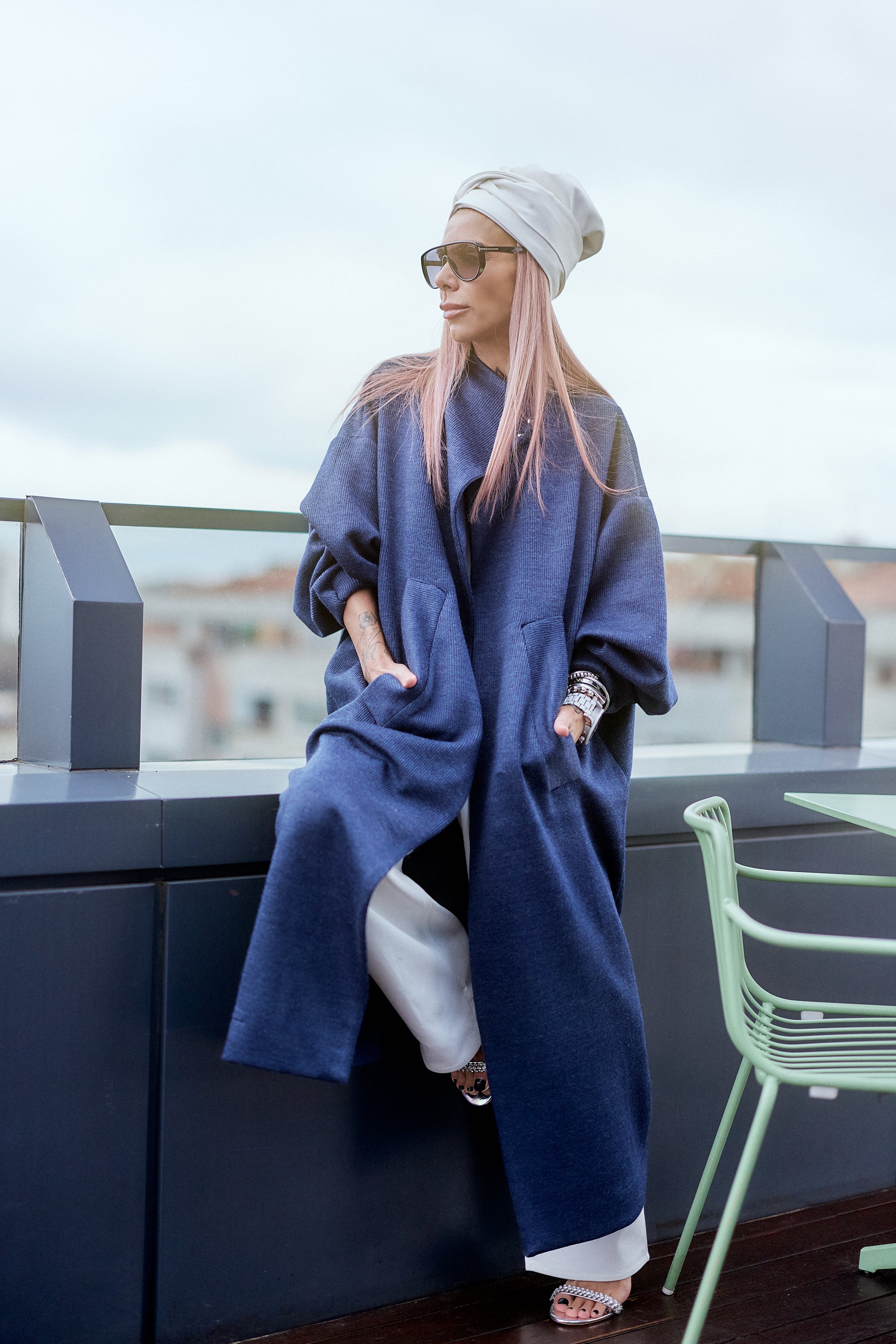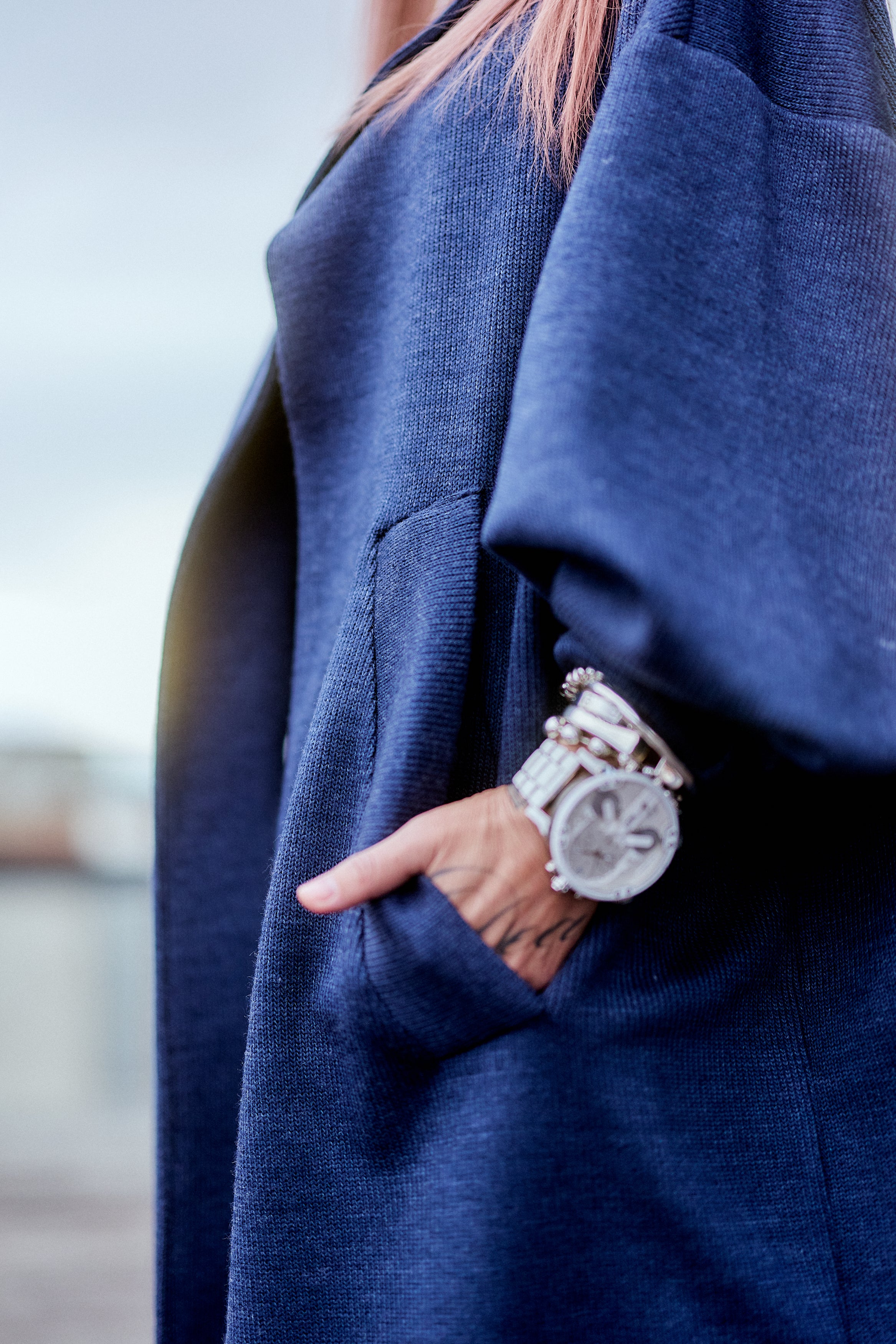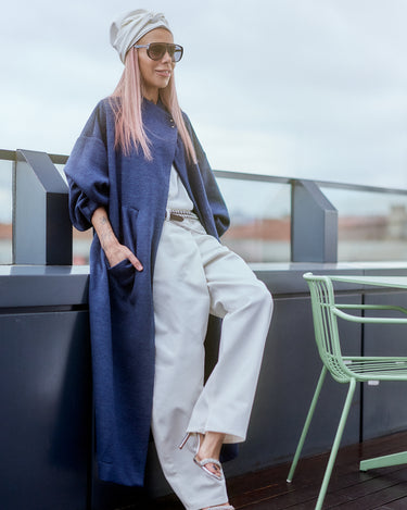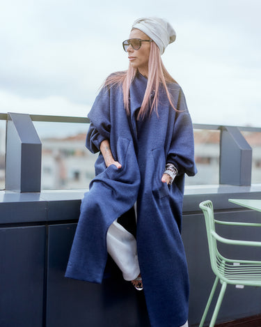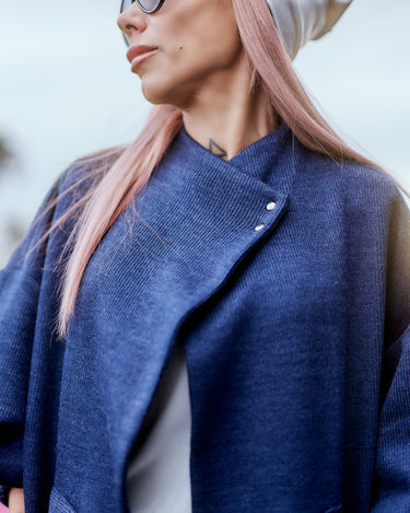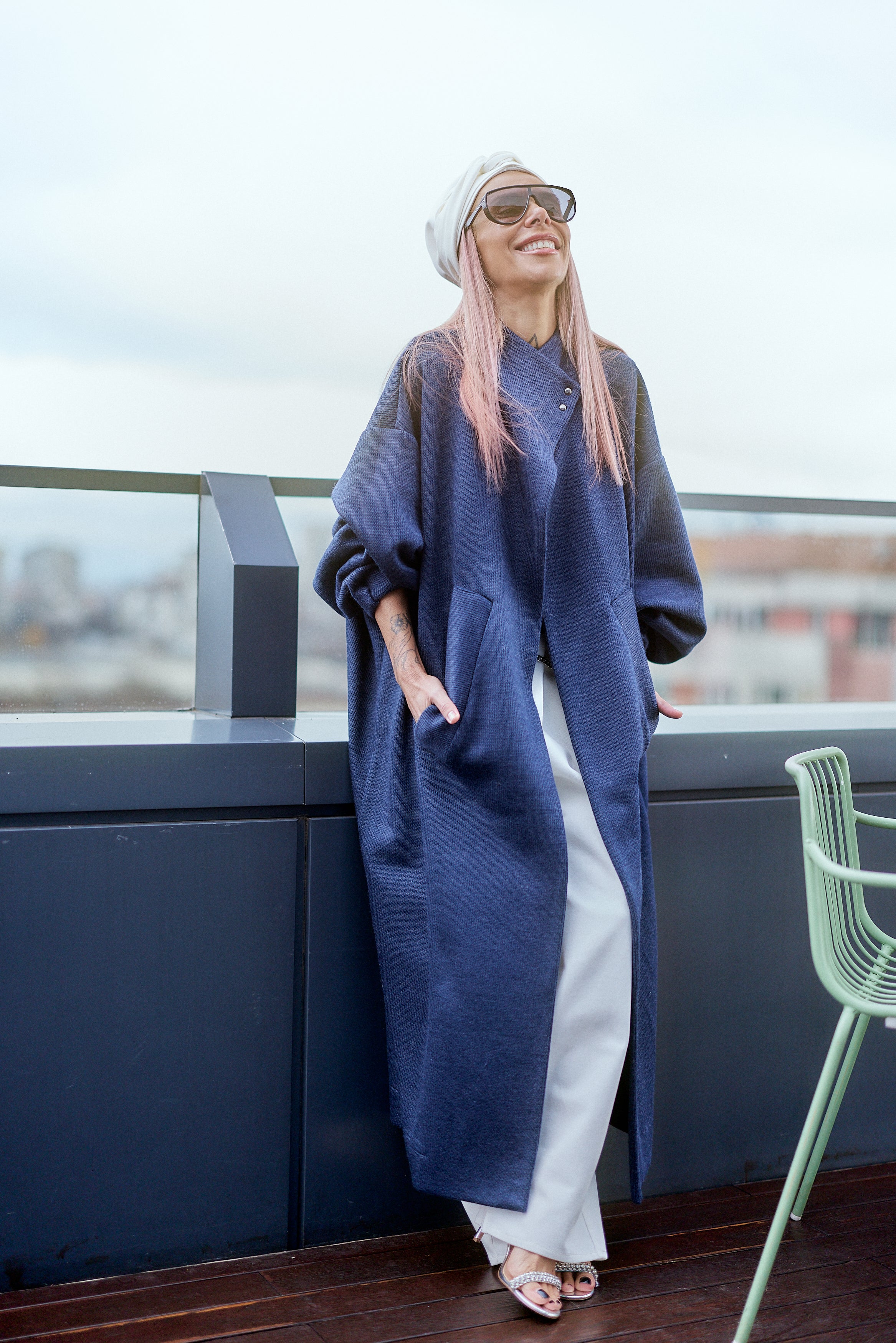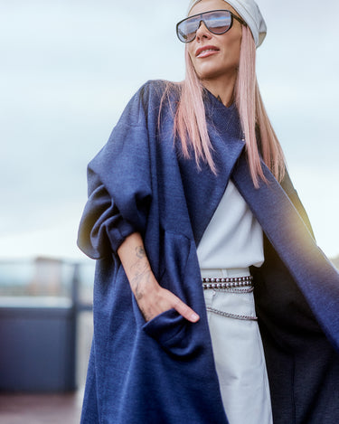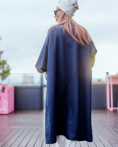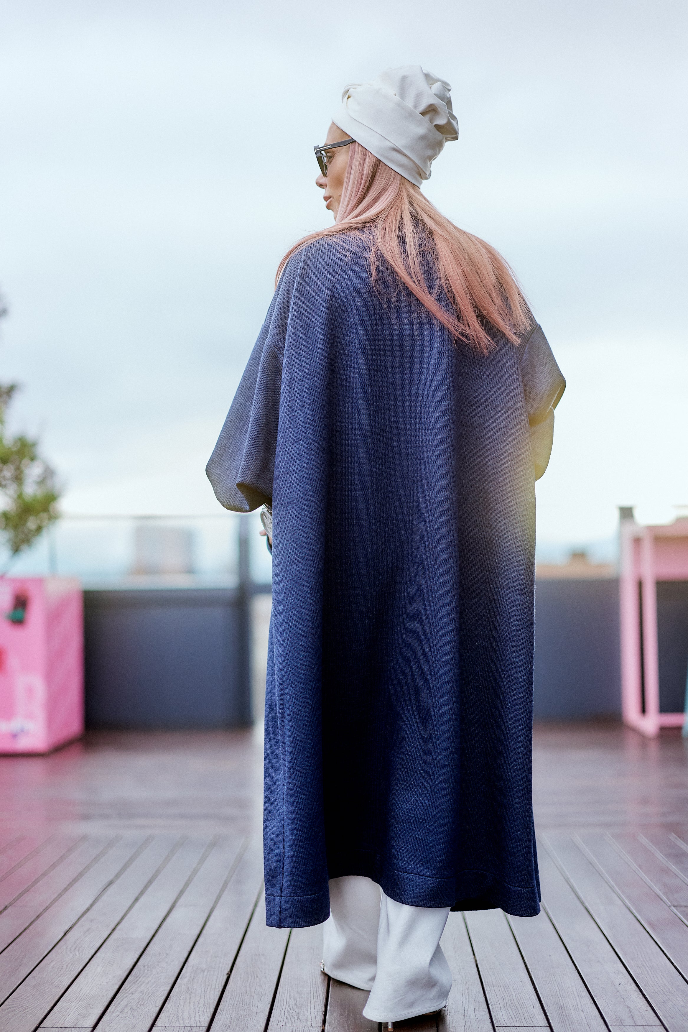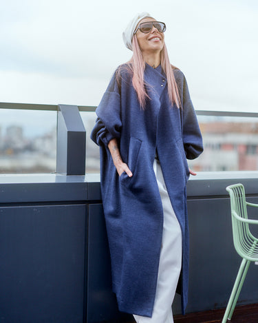 This navy oversized knit coat merges comfort with architectural presence. Designed with a voluminous silhouette, dropped shoulders, and wide sleeves, it drapes effortlessly over any outfit while maintaining a structured, flowing appearance. The soft knit texture and deep hue add understated luxury, while front pockets and snap-button details bring practicality and modern edge. A piece that redefines cozy sophistication — ideal for layering through transitional seasons or creating a bold minimalist look.