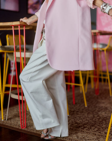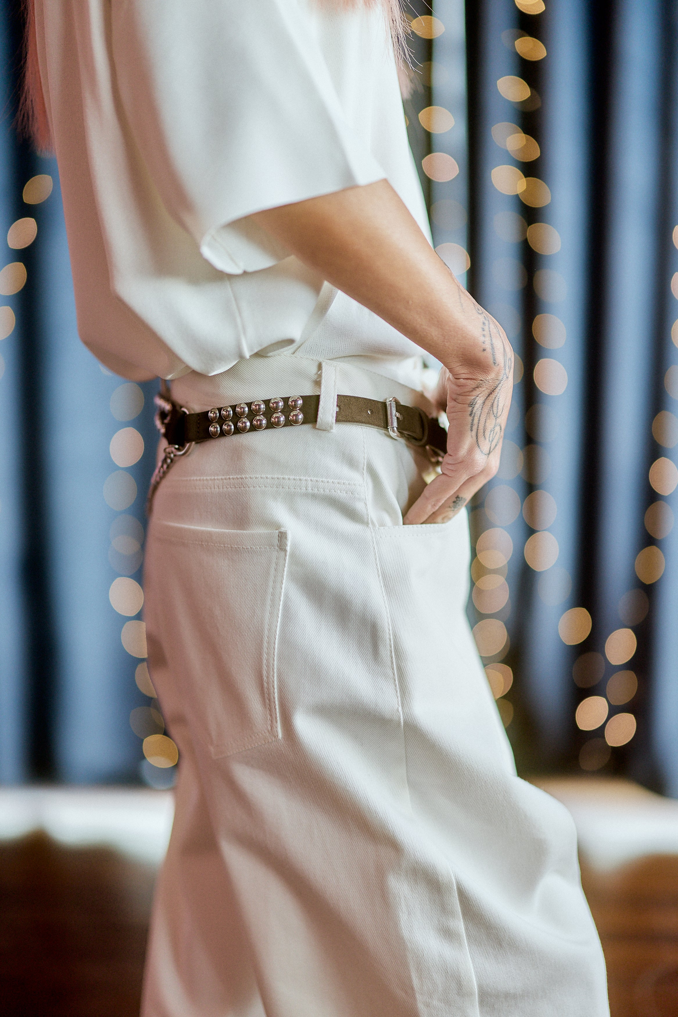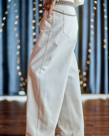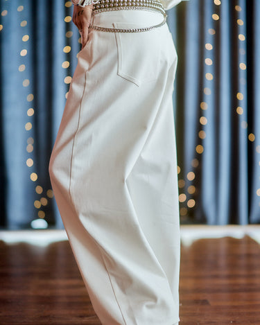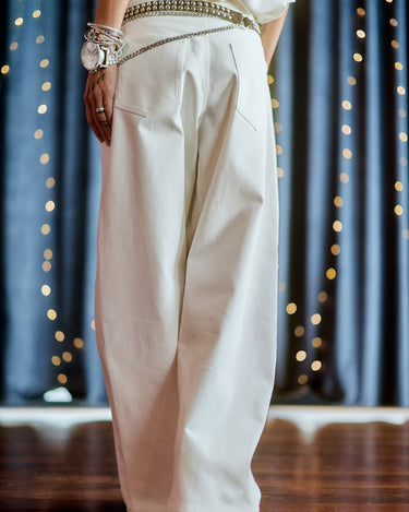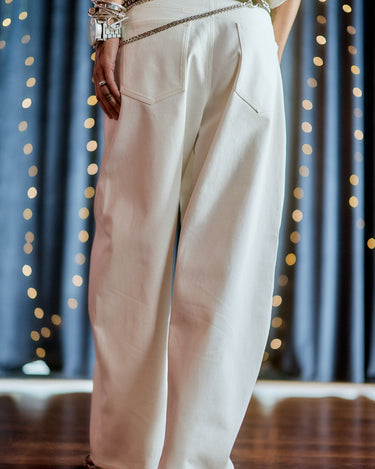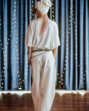 These white wide-leg jeans redefine minimalism with a structured yet fluid shape. Crafted from premium cotton denim, they feature clean lines, practical back pockets, and a relaxed high-rise fit that flatters every silhouette. The design combines contemporary edge with timeless versatility, easily styled with casual tees or statement tops. A staple piece for bold, modern dressing.