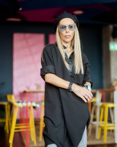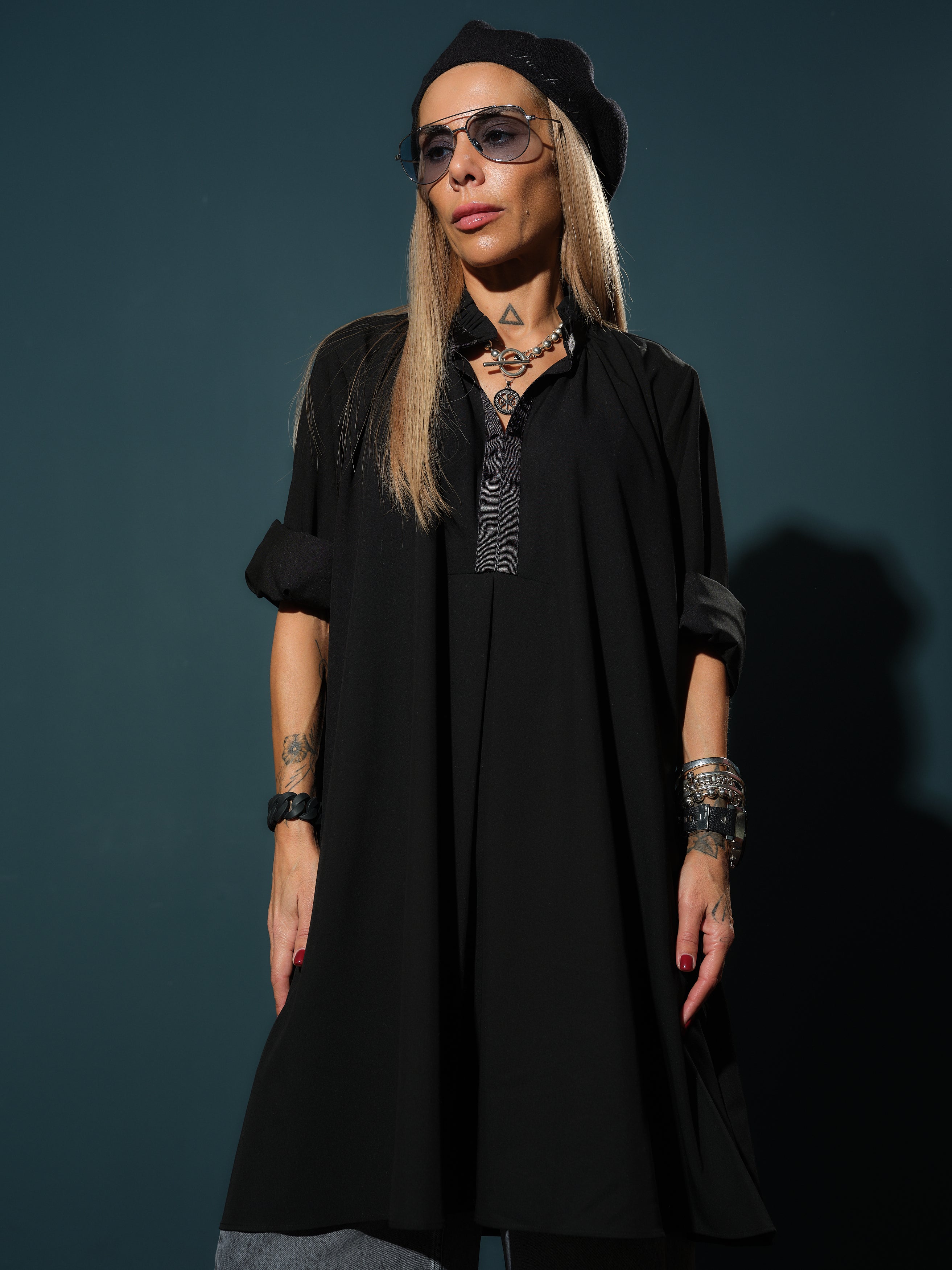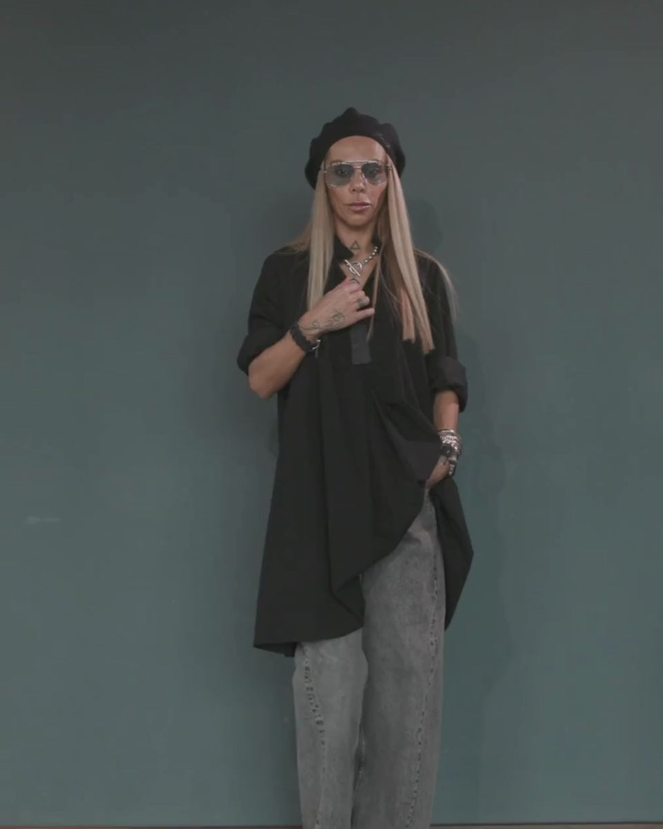 Its versatile length and effortless drape make it easy to style — wear it as a dress, layered over wide-leg denim, or unbuttoned as a lightweight coat. The slightly asymmetrical hem and side pockets add a touch of nonchalant sophistication.