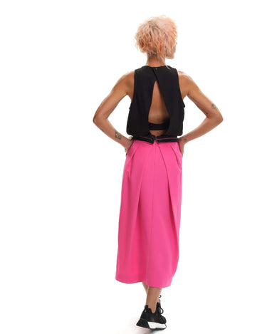Magenta pleated midi skirt featuring functional pockets and a foldable waistband with contrasting black detailing. Please note that this skirt is unlined.