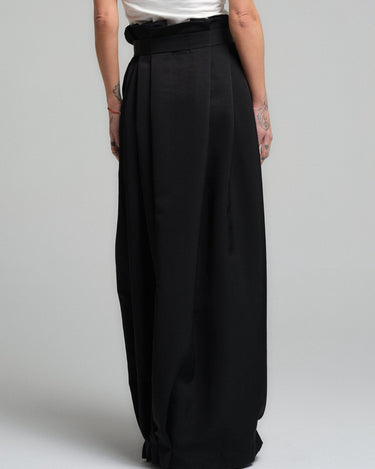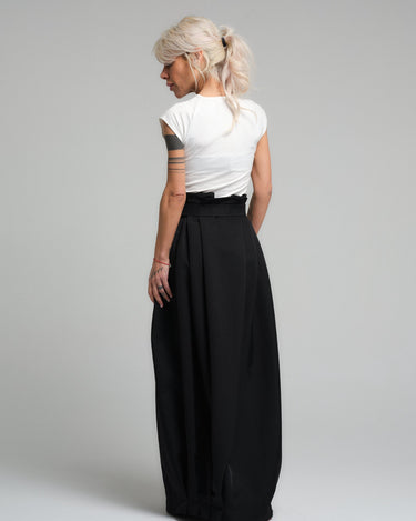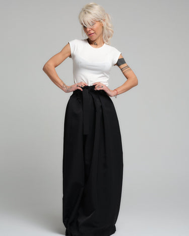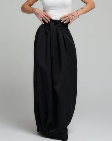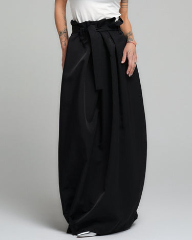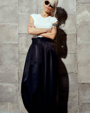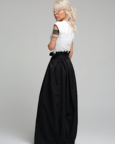 Make a bold statement with our high-waist skirt, the epitome of tailored elegance. This skirt is fashioned from premium polyester, delivering a smooth finish with a substantial feel that gracefully flows with every step. The design is accentuated by a tasteful belt that cinches the waist, while the elasticated back ensures a snug and comfortable fit. Its voluminous silhouette and sleek lines make it a versatile piece for both office wear and evening affairs.