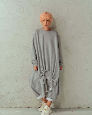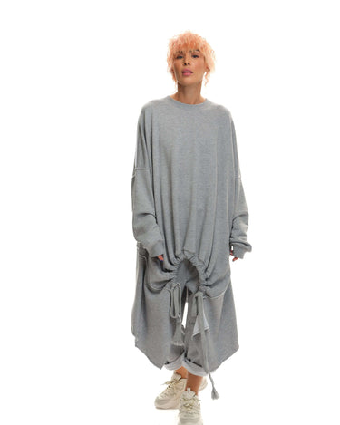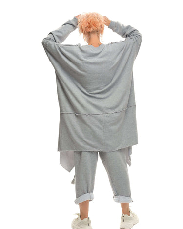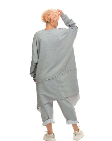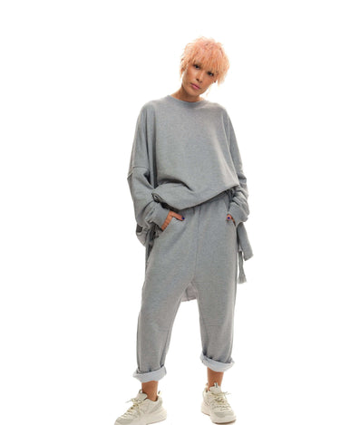 Oversize two-piece sweatsuit set with raw hem details and gathering at the front. Comfy joggers with functional pockets.
