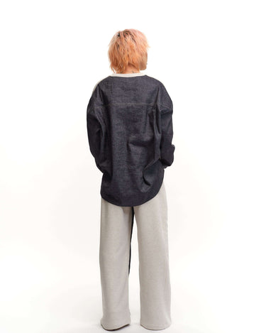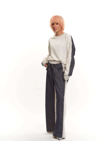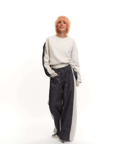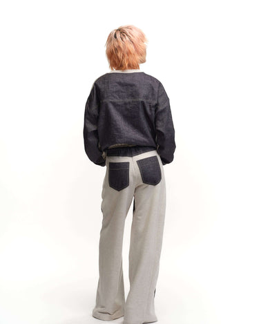 Color-block set featuring a crew neck top with an extended imitation denim back. Matching double-waisted bottoms with functional pockets.