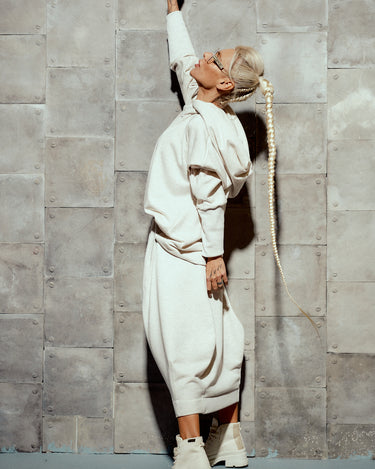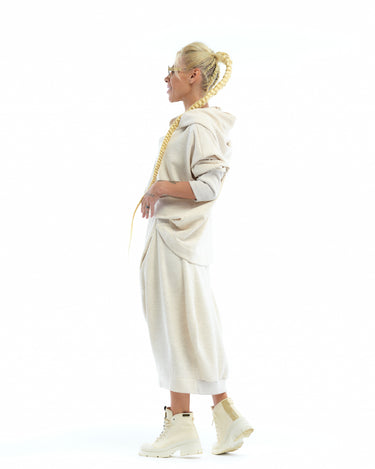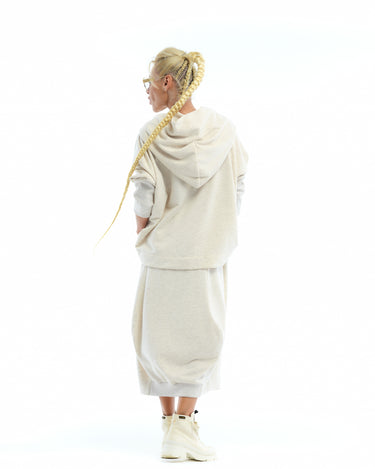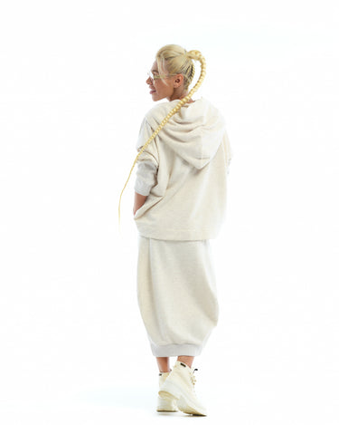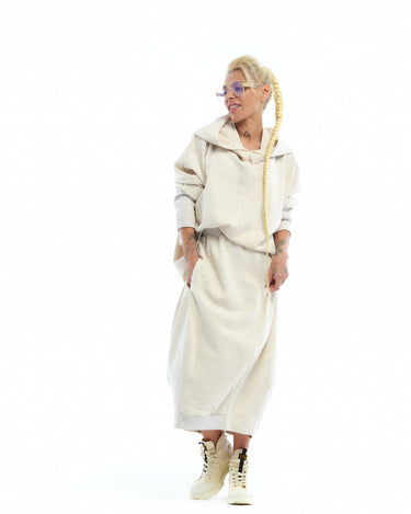 A two-piece hoodie and skirt set. Elastic waist skirt with functional pockets.