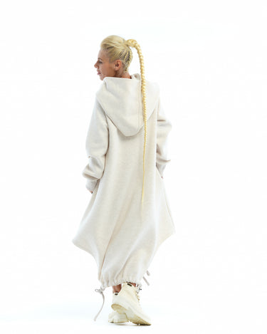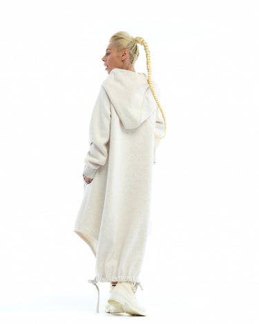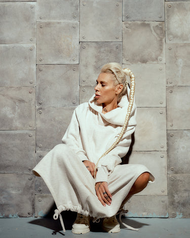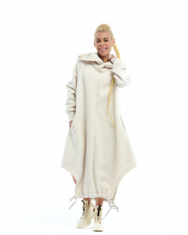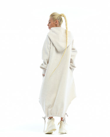 Oversized hoodie dress with functional pockets. Elastic hem with ties.