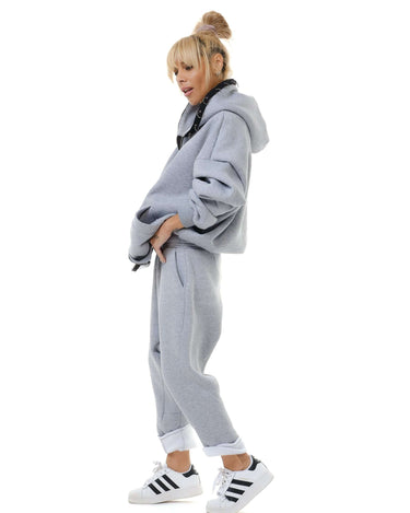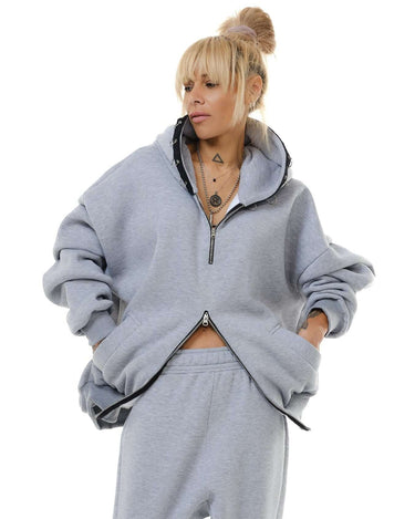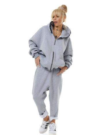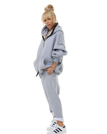 Step into elevated comfort with our Grey Zip Hoodie & Jogger Set—a minimalist essential reimagined with a subtle streetwear attitude. Made from ultra-soft, cozy fleece, this relaxed-fit ensemble pairs an oversized zip-up hoodie with tailored joggers for an effortlessly cool silhouette. The hoodie features dual front zippers and a statement drawstring hood lined with branded decorative tape, while the pants offer a slouchy fit with tapered, cuffed ankles for laid-back sophistication.