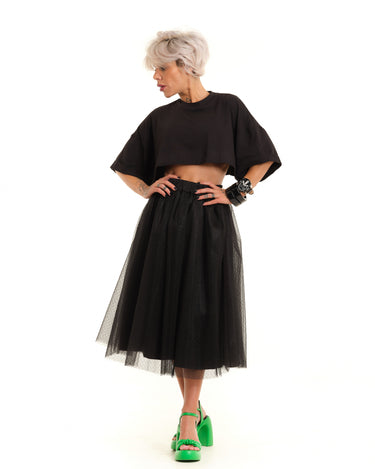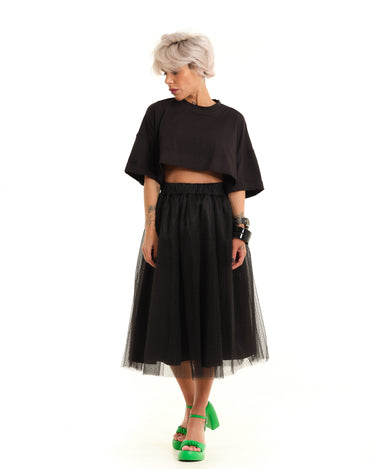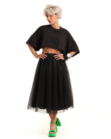 A relaxed round-neck crop top with elbow-length sleeves and a print at the back.