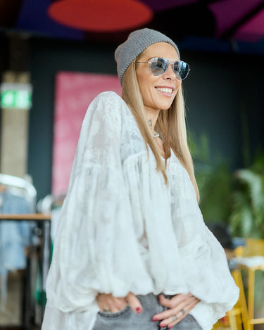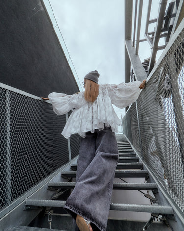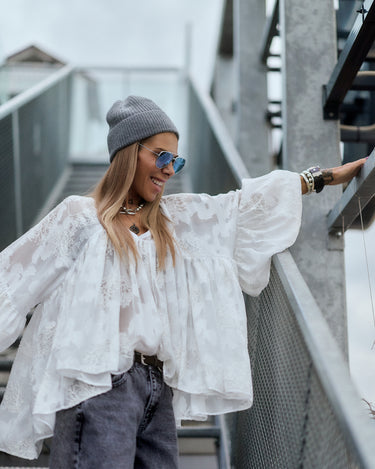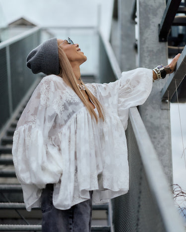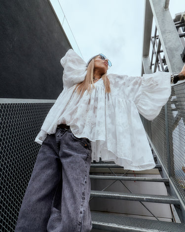 The White Sheer Tunic is where romance meets edge. Crafted from lightweight sheer fabric with intricate tonal floral embroidery, this piece flows effortlessly while adding structure through its voluminous silhouette. The deep V-neckline and gathered details create soft movement and a statement shape that captures the essence of modern femininity.