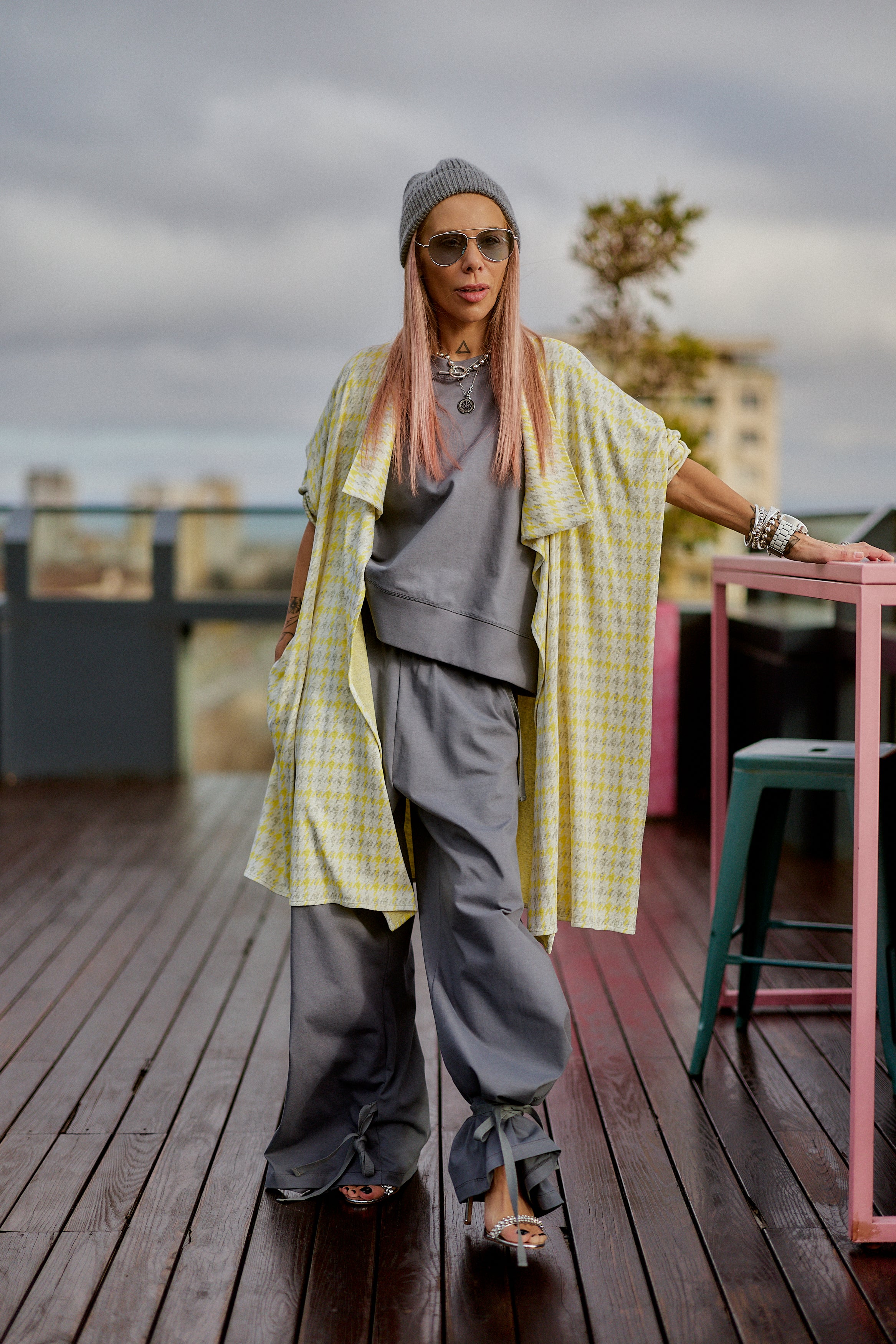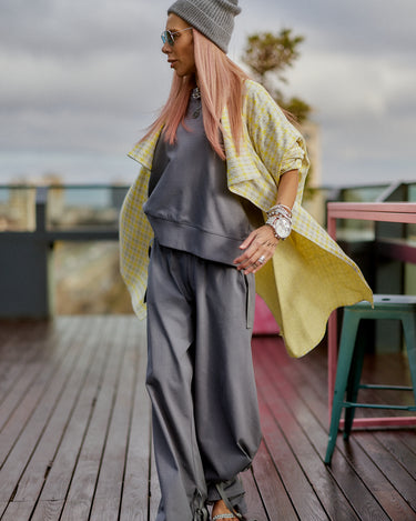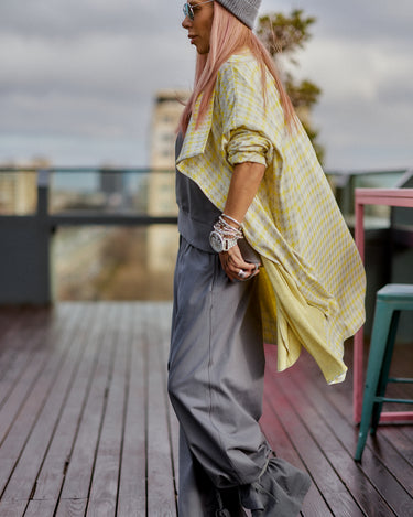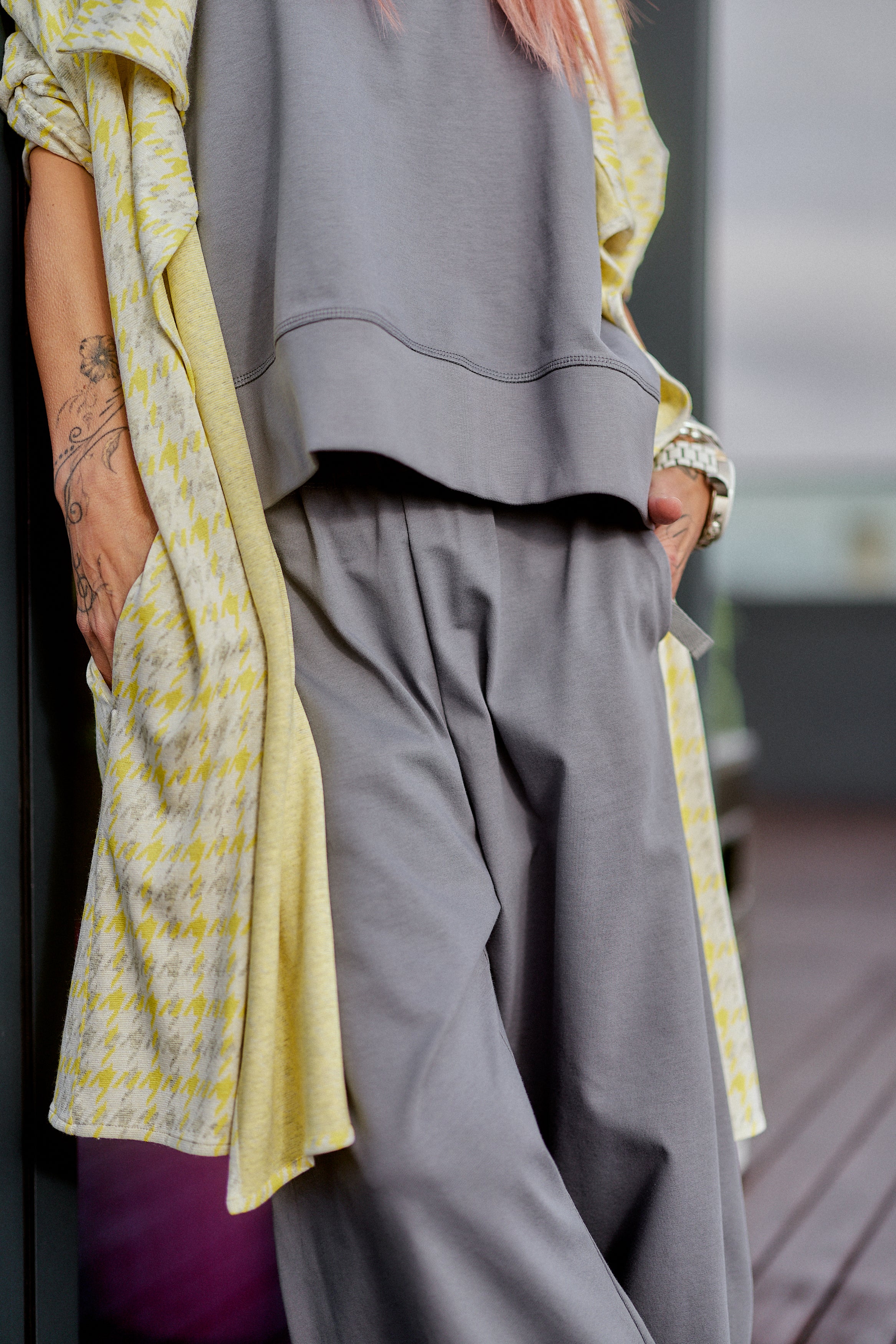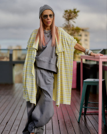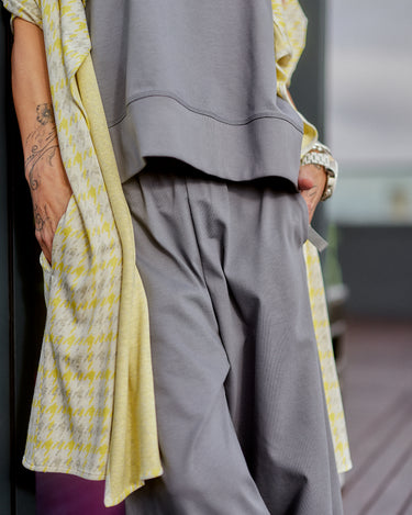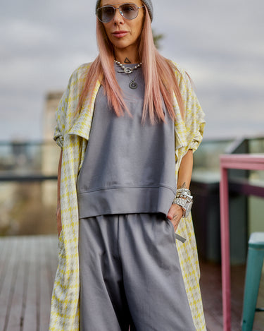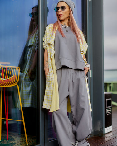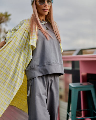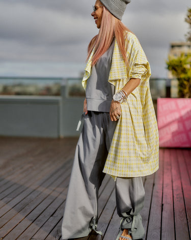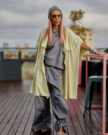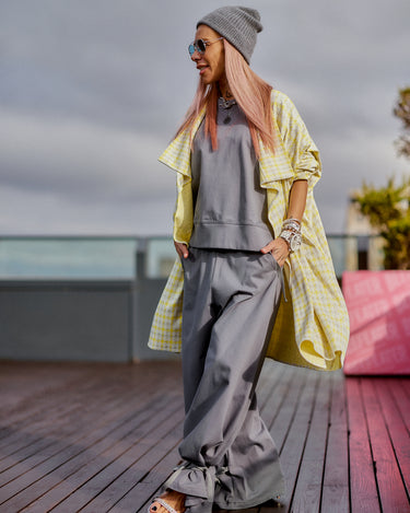 This 3-piece set balances relaxed structure with a strong urban attitude. The grey base creates a clean, minimalist foundation, while the houndstooth vest adds contrast and character without overpowering the look. The silhouette is fluid and comfortable, designed to move naturally with the body while maintaining a refined edge. Each piece works seamlessly together, offering a layered look that feels intentional, modern, and versatile. The set is ideal for women who value comfort but refuse to compromise on presence, making it suitable for both everyday wear and elevated casual moments.
