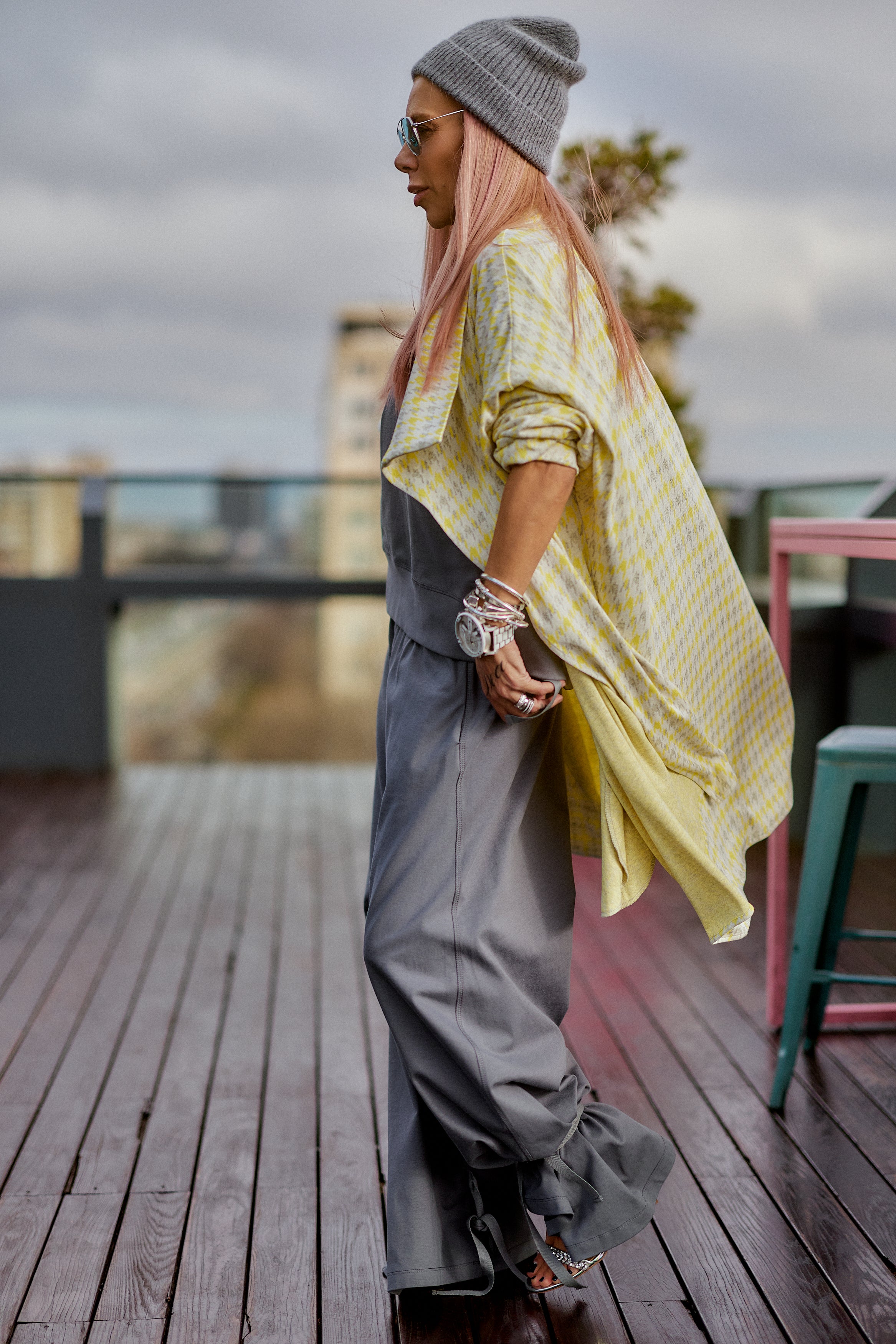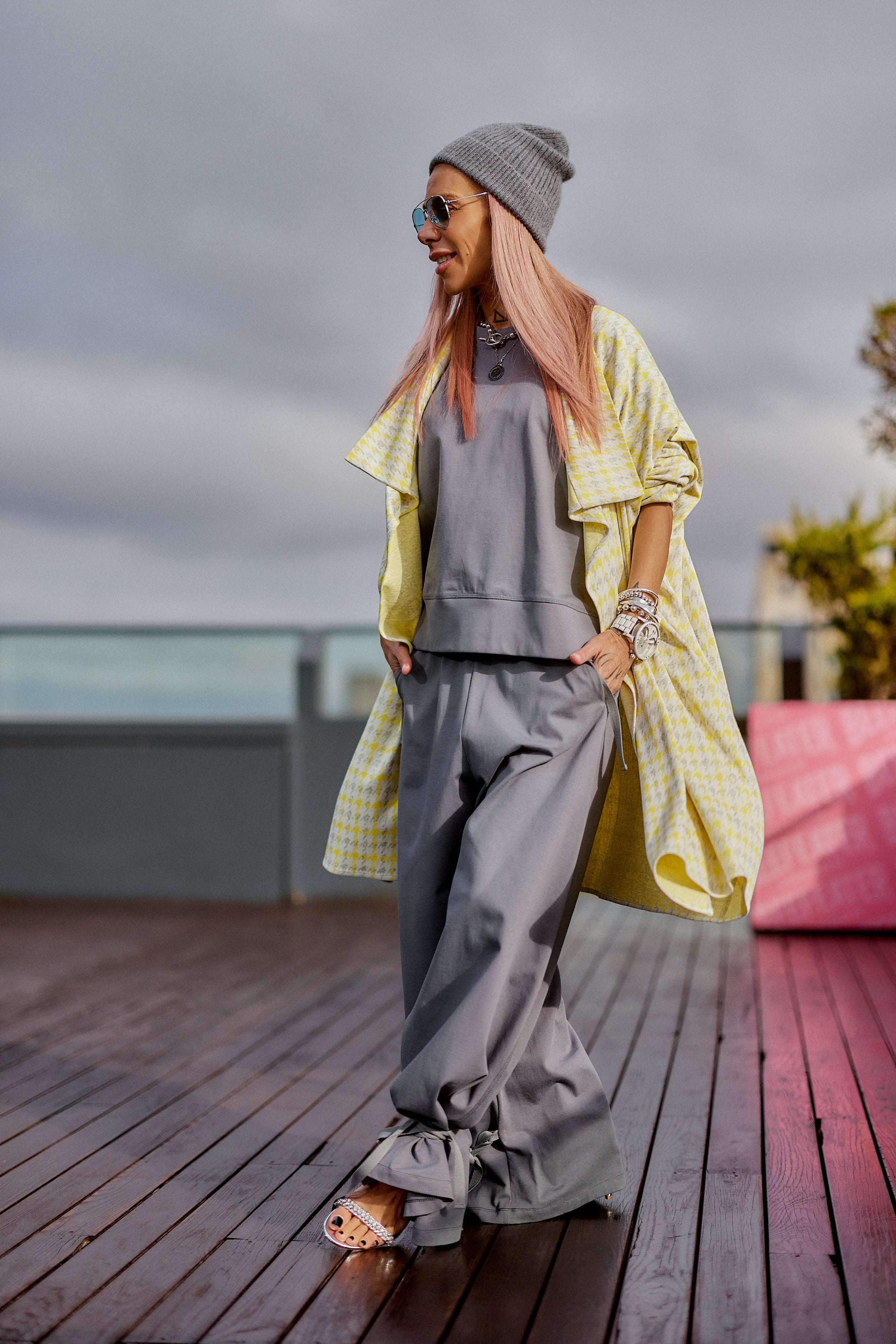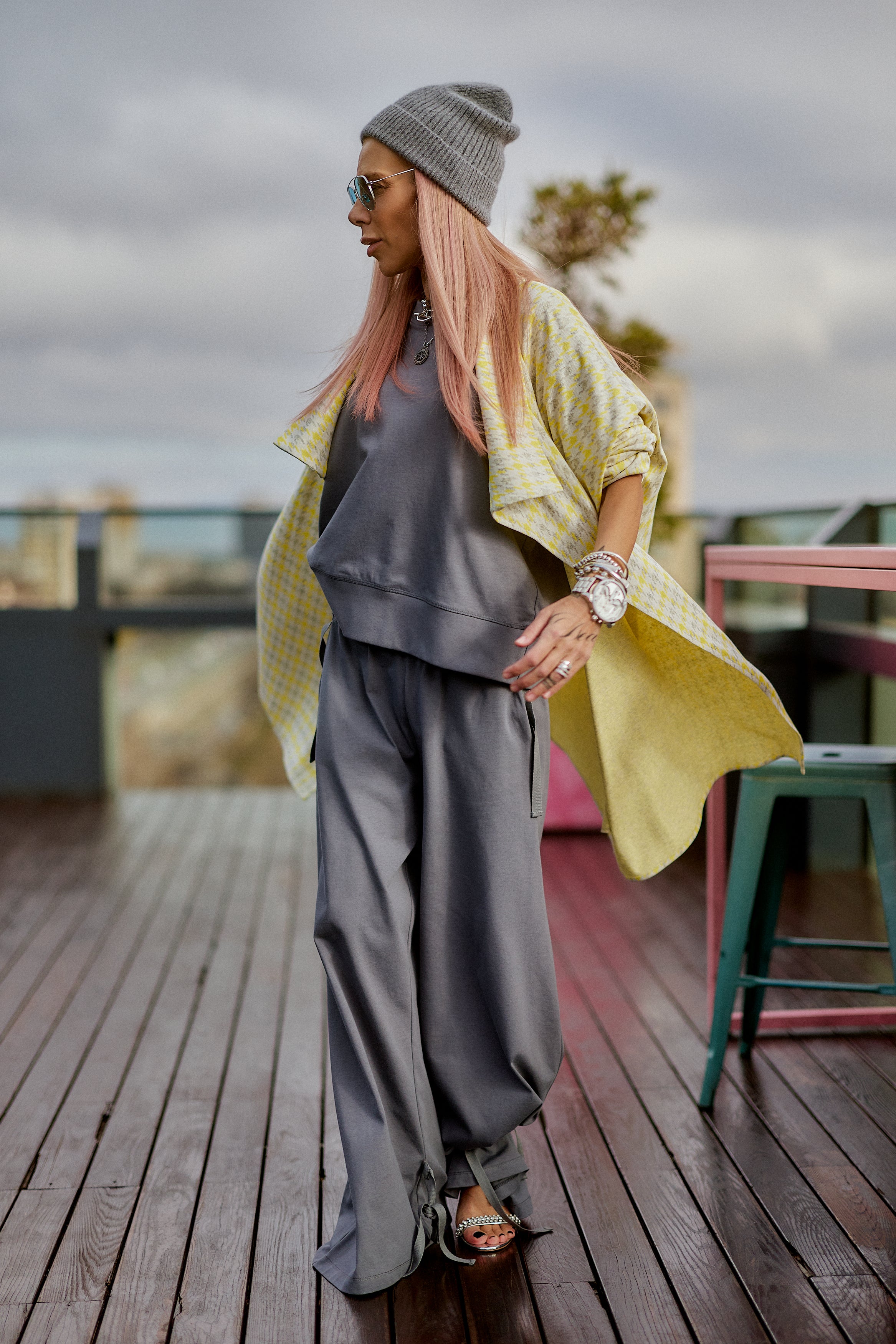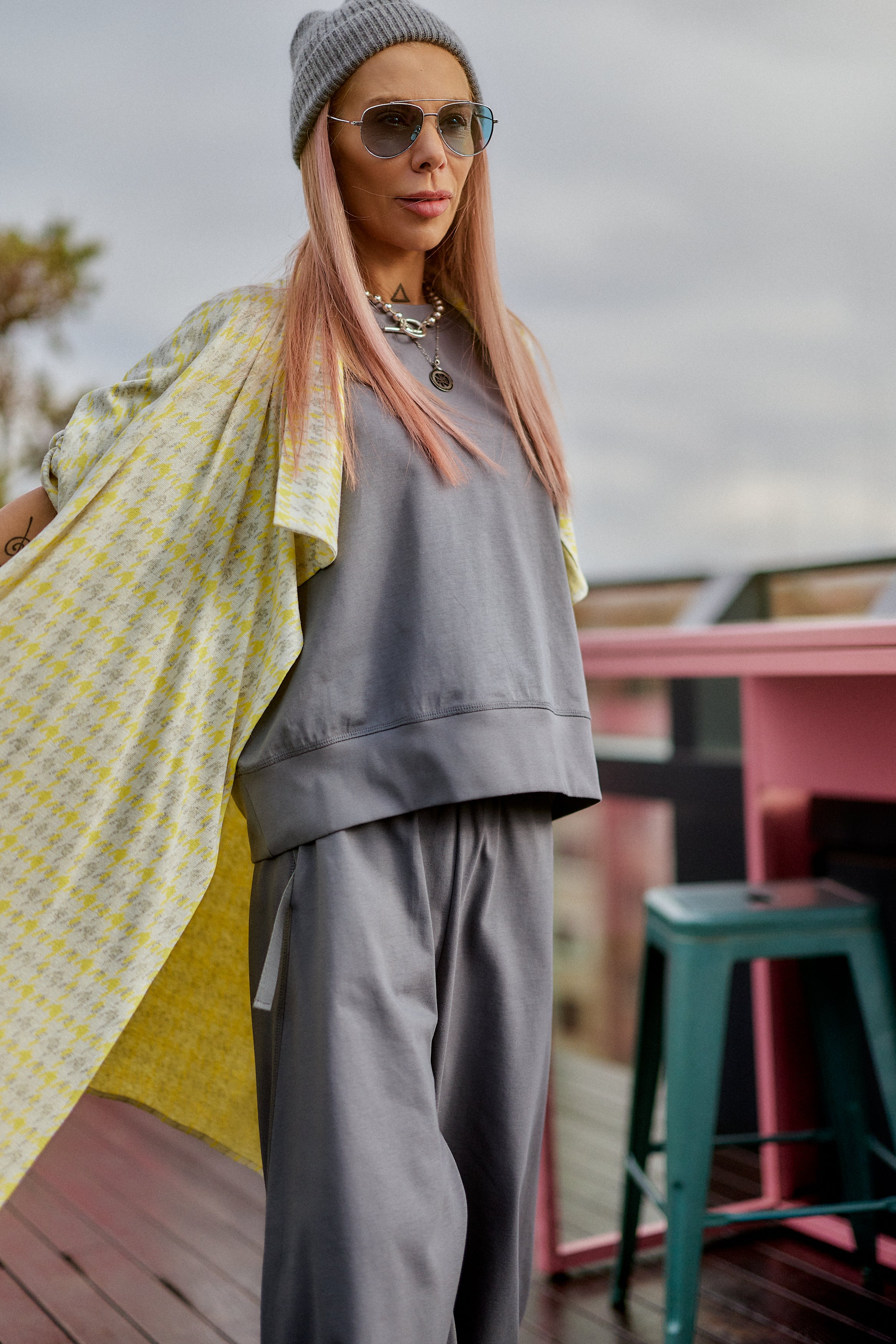 This 3-piece set balances relaxed structure with a strong urban attitude. The grey base creates a clean, minimalist foundation, while the houndstooth vest adds contrast and character without overpowering the look. The silhouette is fluid and comfortable, designed to move naturally with the body while maintaining a refined edge. Each piece works seamlessly together, offering a layered look that feels intentional, modern, and versatile. The set is ideal for women who value comfort but refuse to compromise on presence, making it suitable for both everyday wear and elevated casual moments.