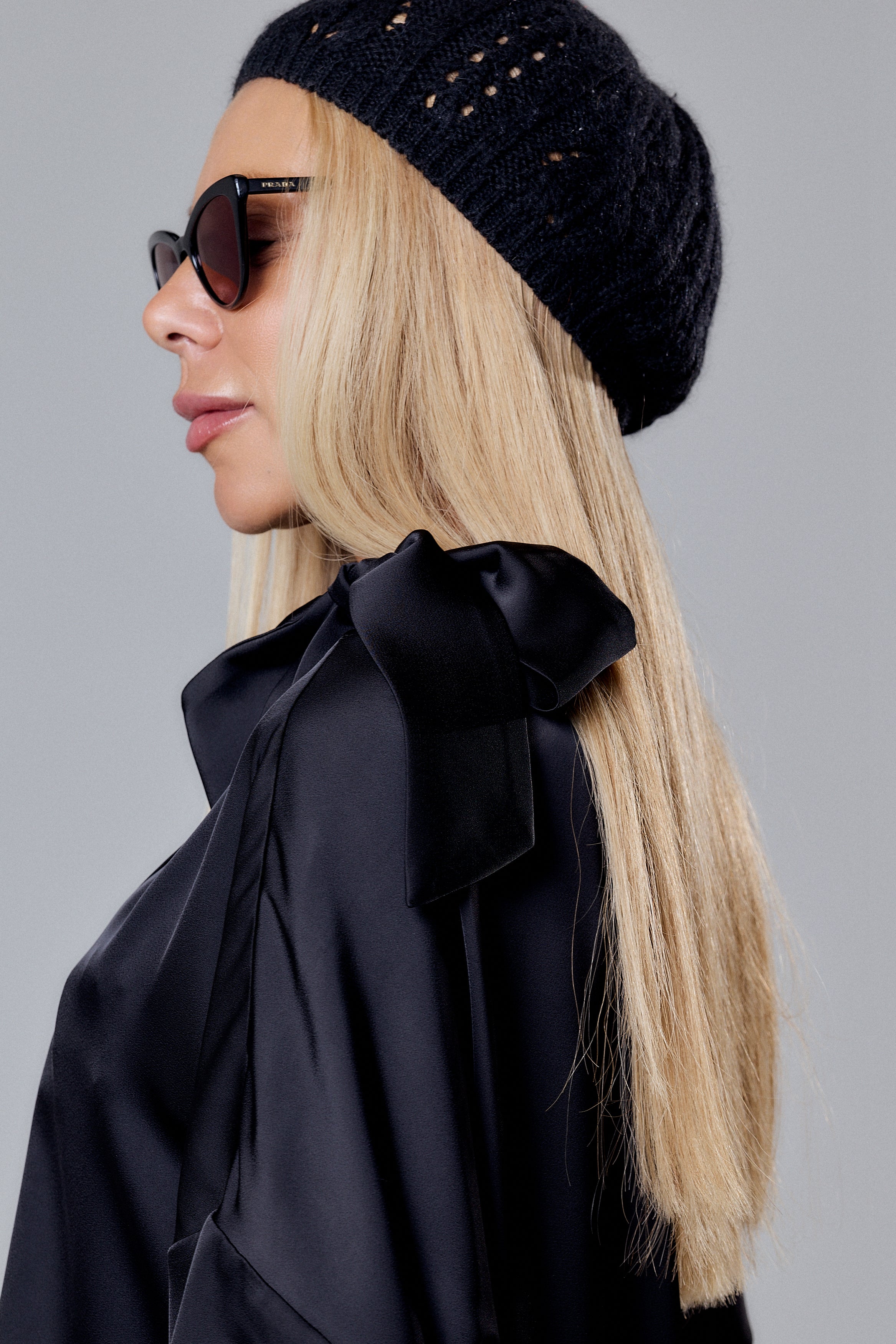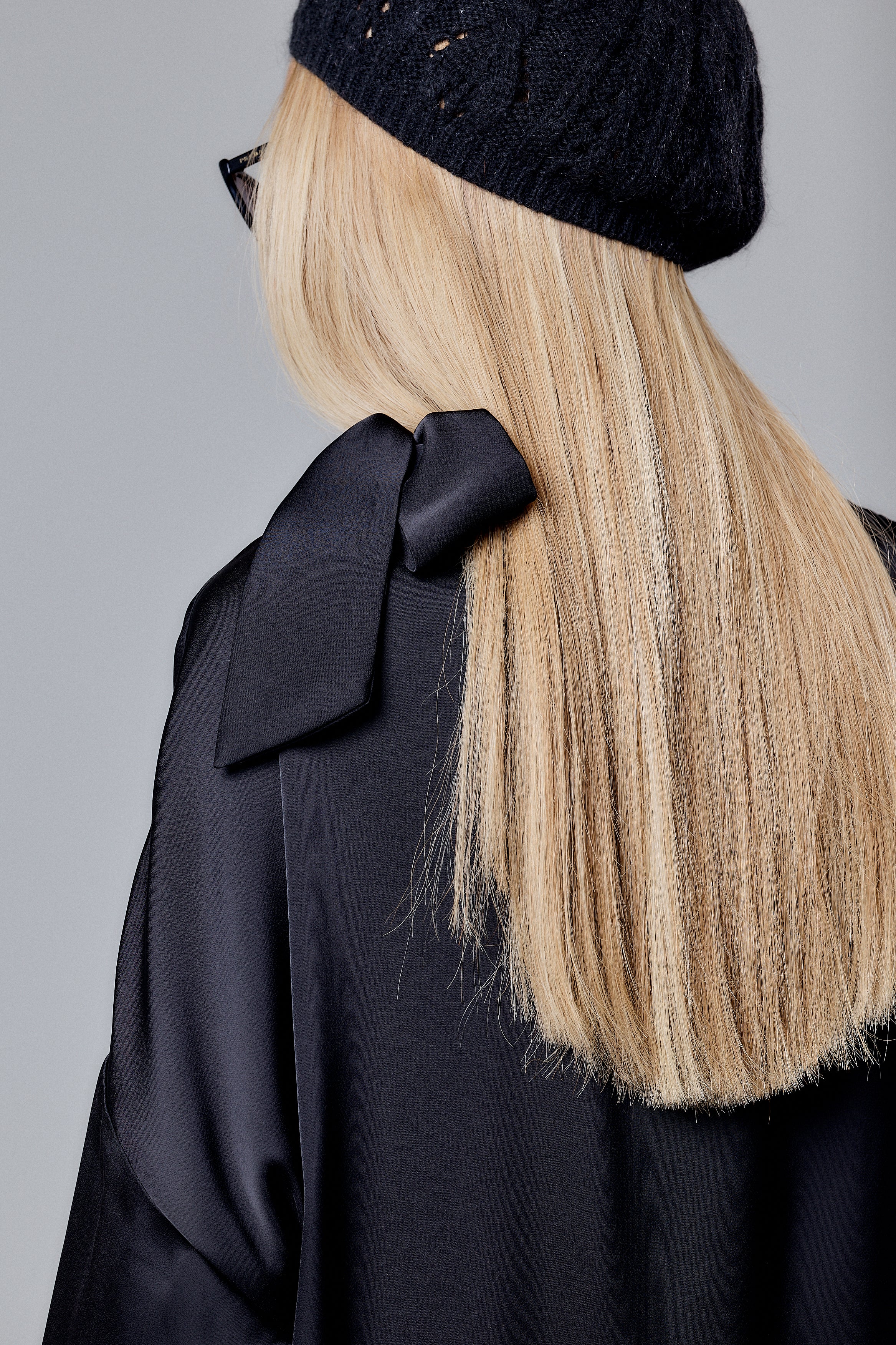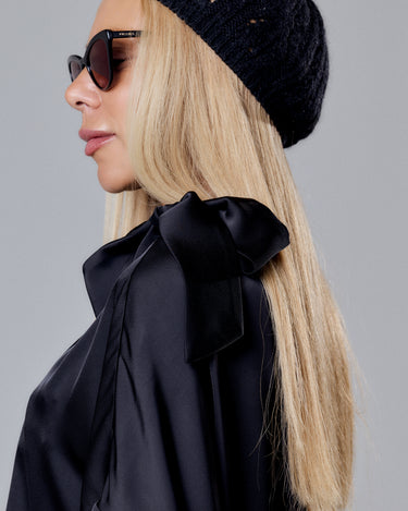 Wear it with silver heels and layered jewelry for a refined, modern look. For a more casual aesthetic, pair it with loafers and a beret. The bow detail makes it ideal for minimal accessories — let the fabric and cut speak for themselves.