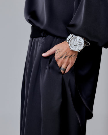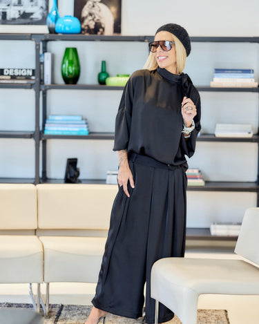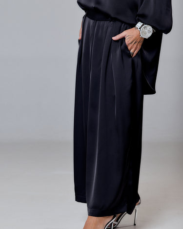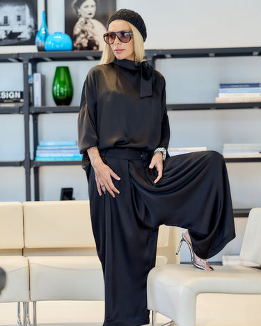 A timeless statement of sophistication — this black satin set is where minimalism meets feminine allure. The top features a relaxed silhouette with a graceful shoulder bow that adds a touch of couture detail. The soft sheen of the satin fabric captures light beautifully, exuding quiet luxury and effortless confidence.