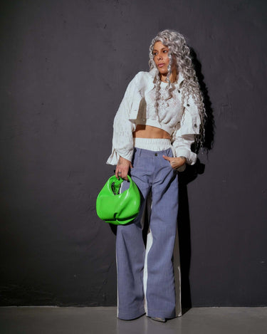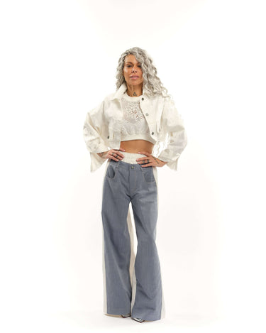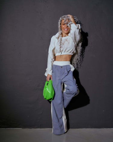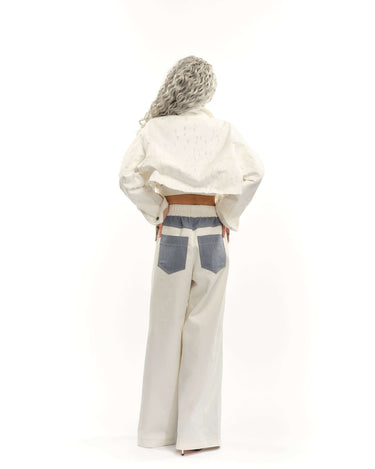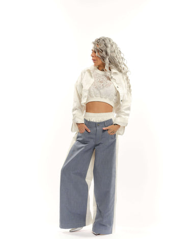 These pants merge denim and cotton into a bold, two-faced color-block effect, creating a dynamic interplay of texture and tone. Designed for those who embrace the unconventional, they turn everyday dressing into a statement.