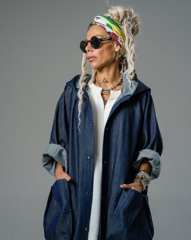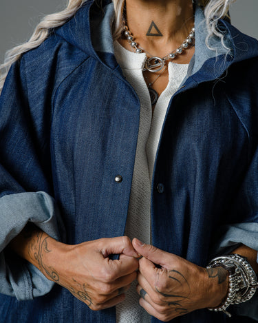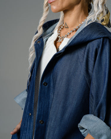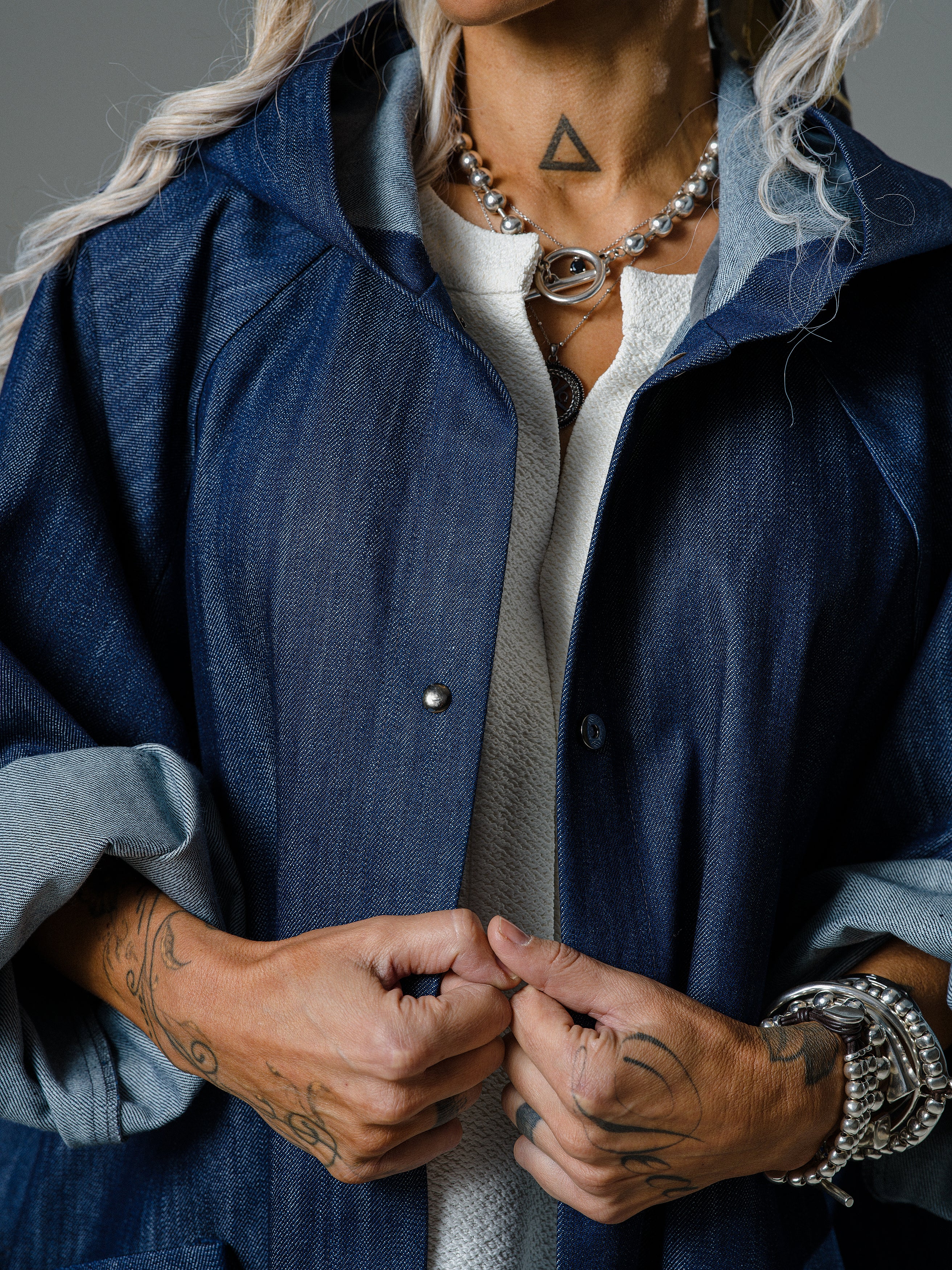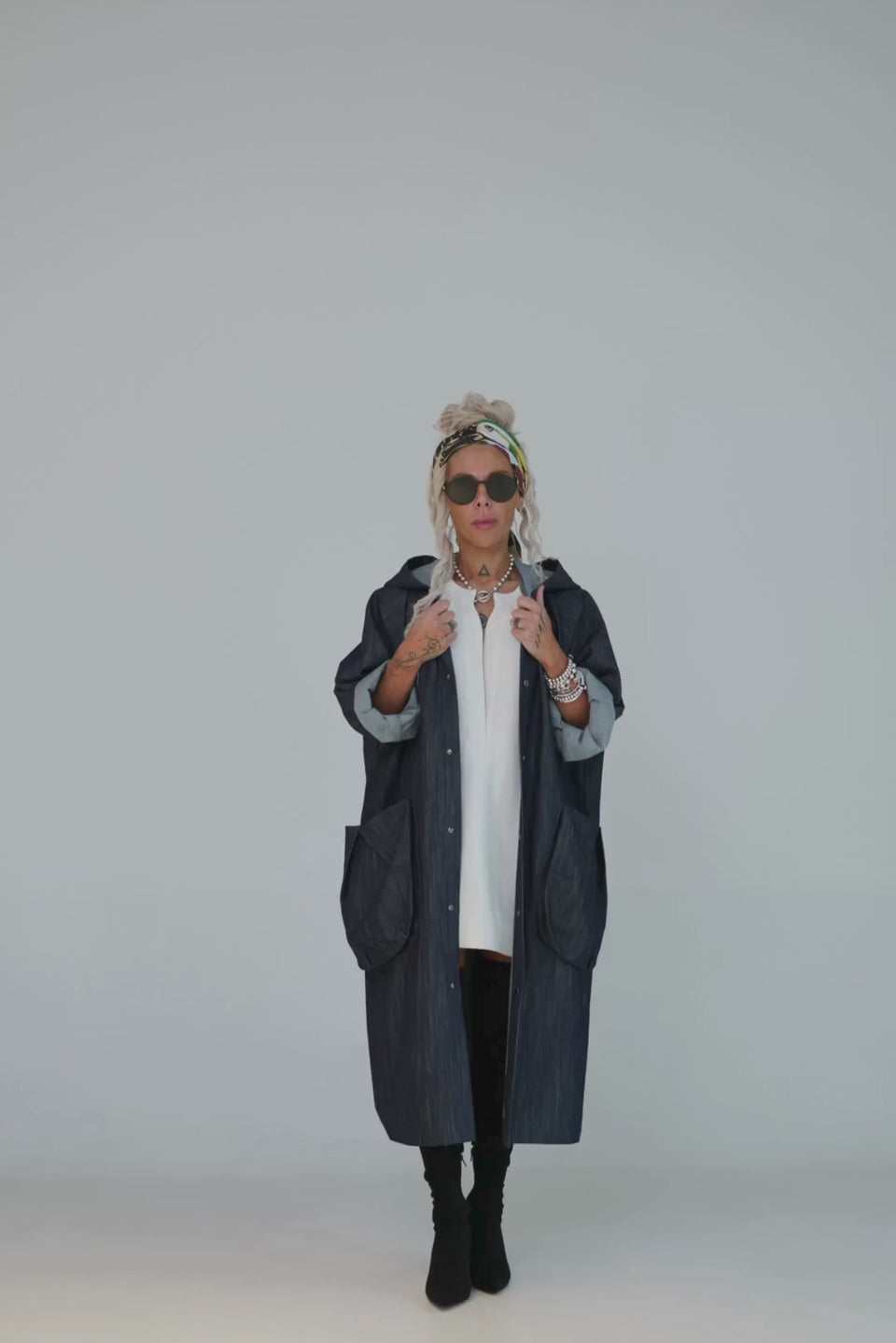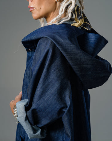 A bold oversized jacket designed with clean architectural lines and strong volume. The structured hood and wide sleeves create a sculpted silhouette, while the matte snap-button front keeps the look minimal and modern.