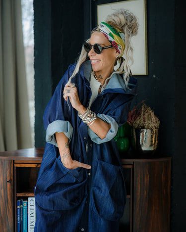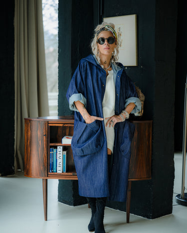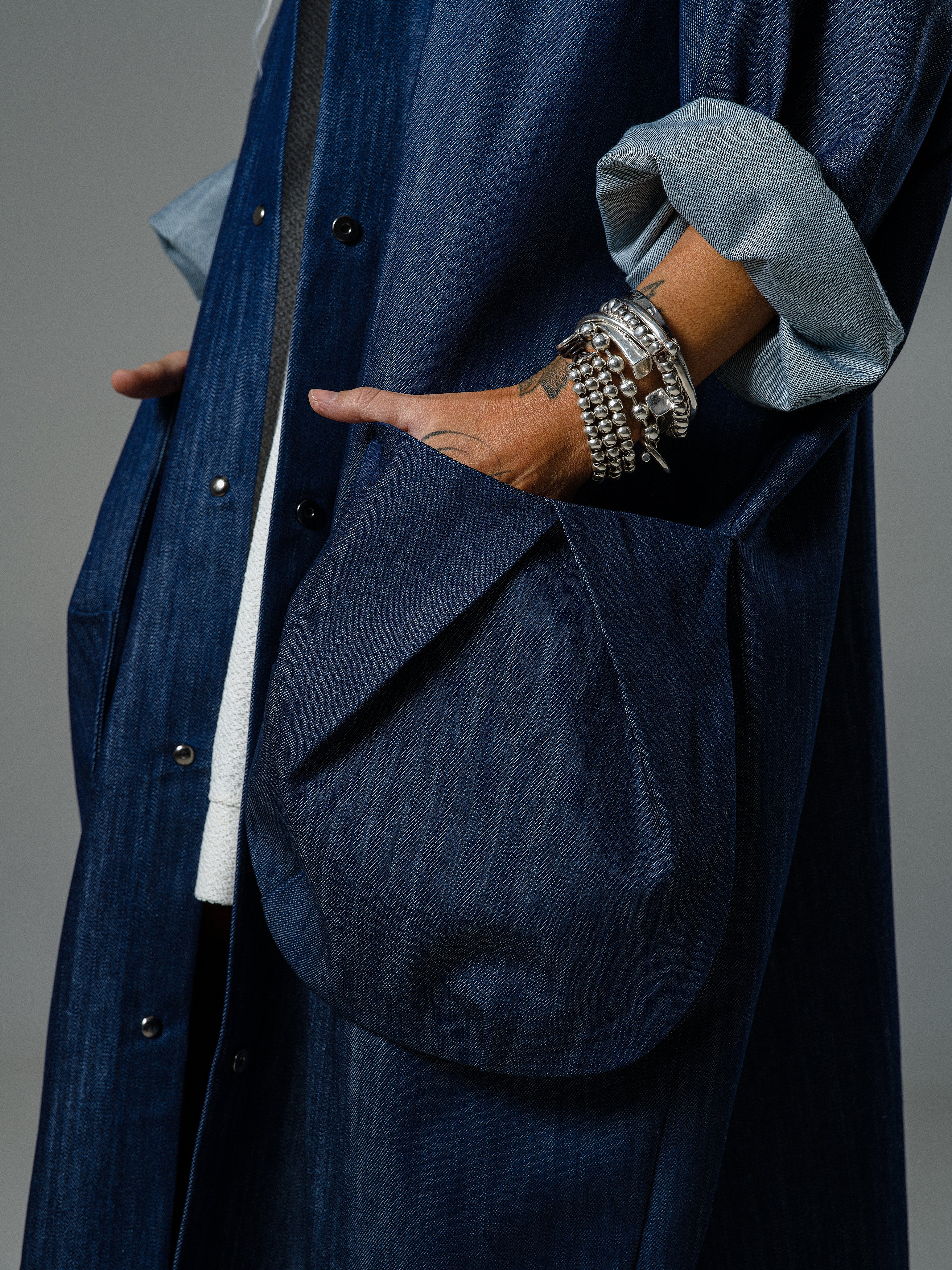 Large statement front pockets add dimension and subtle utility character. The smooth, structured fabric holds its shape beautifully, allowing the jacket to drape with intention rather than excess. The mid-length cut makes it versatile for layering across seasons.