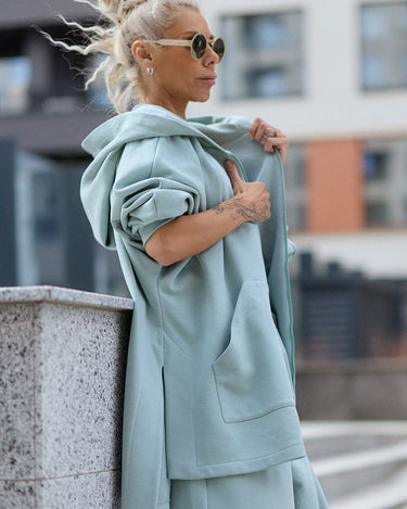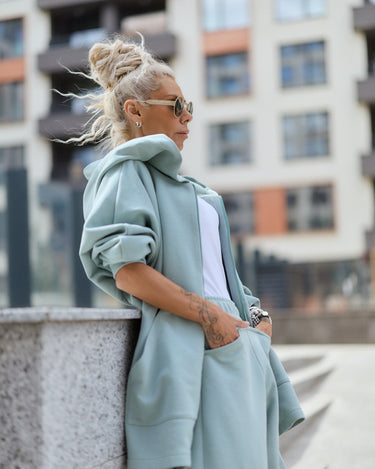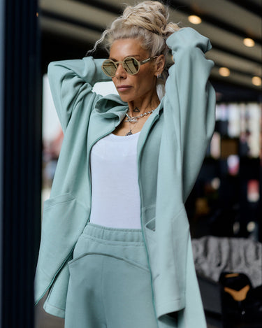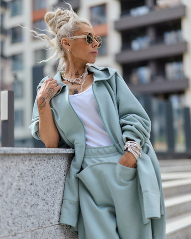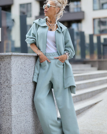 Two-piece set in a muted sage green tone, designed for comfort with a structured, modern silhouette. The set includes a zip-up hoodie and wide-leg pants, both made from a dense, smooth fabric that holds its shape while remaining soft on the skin.