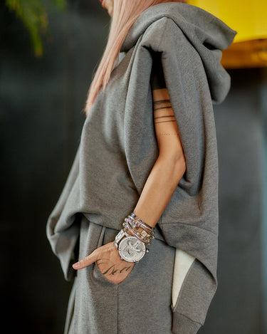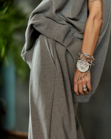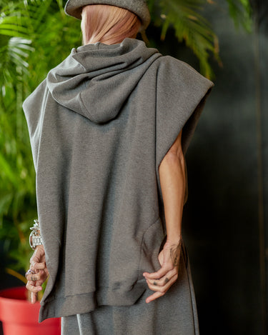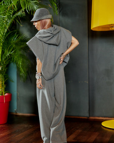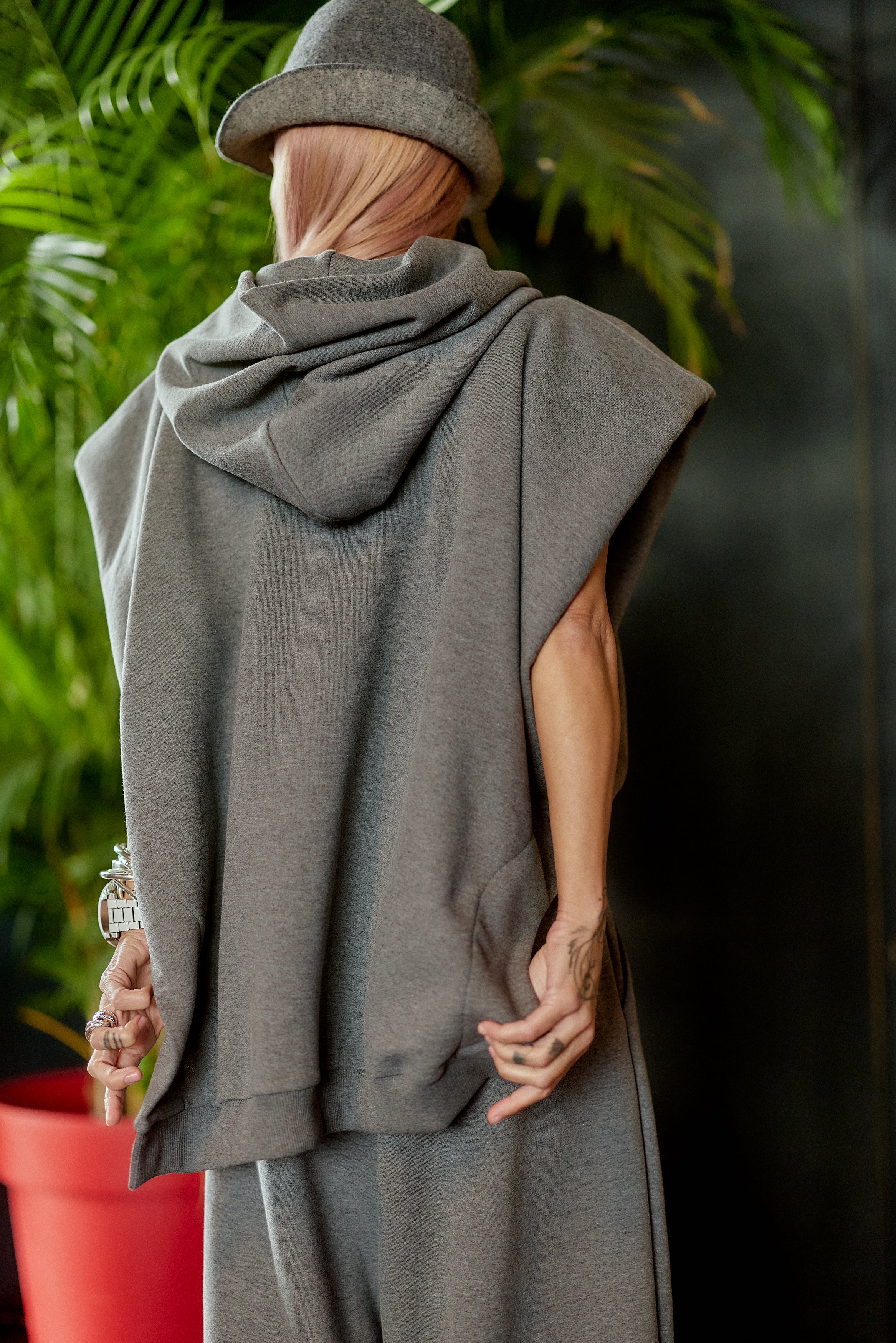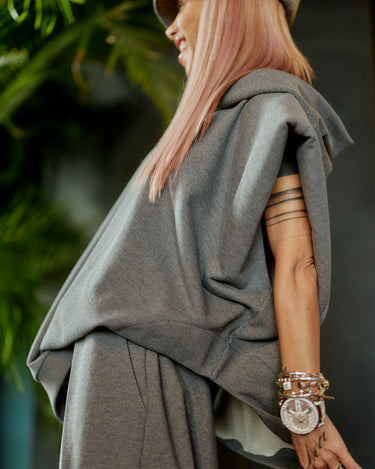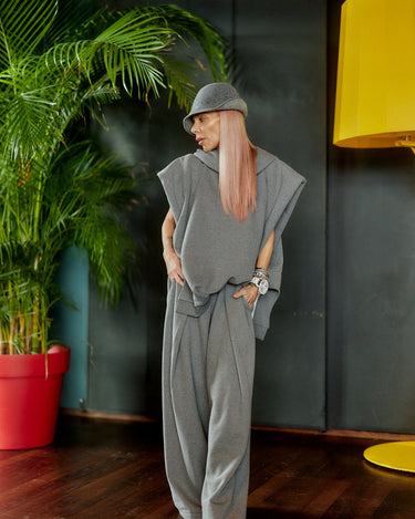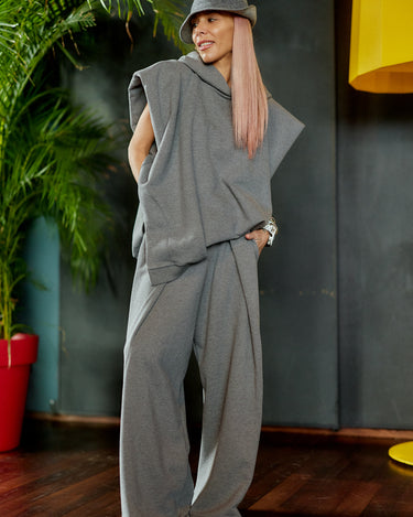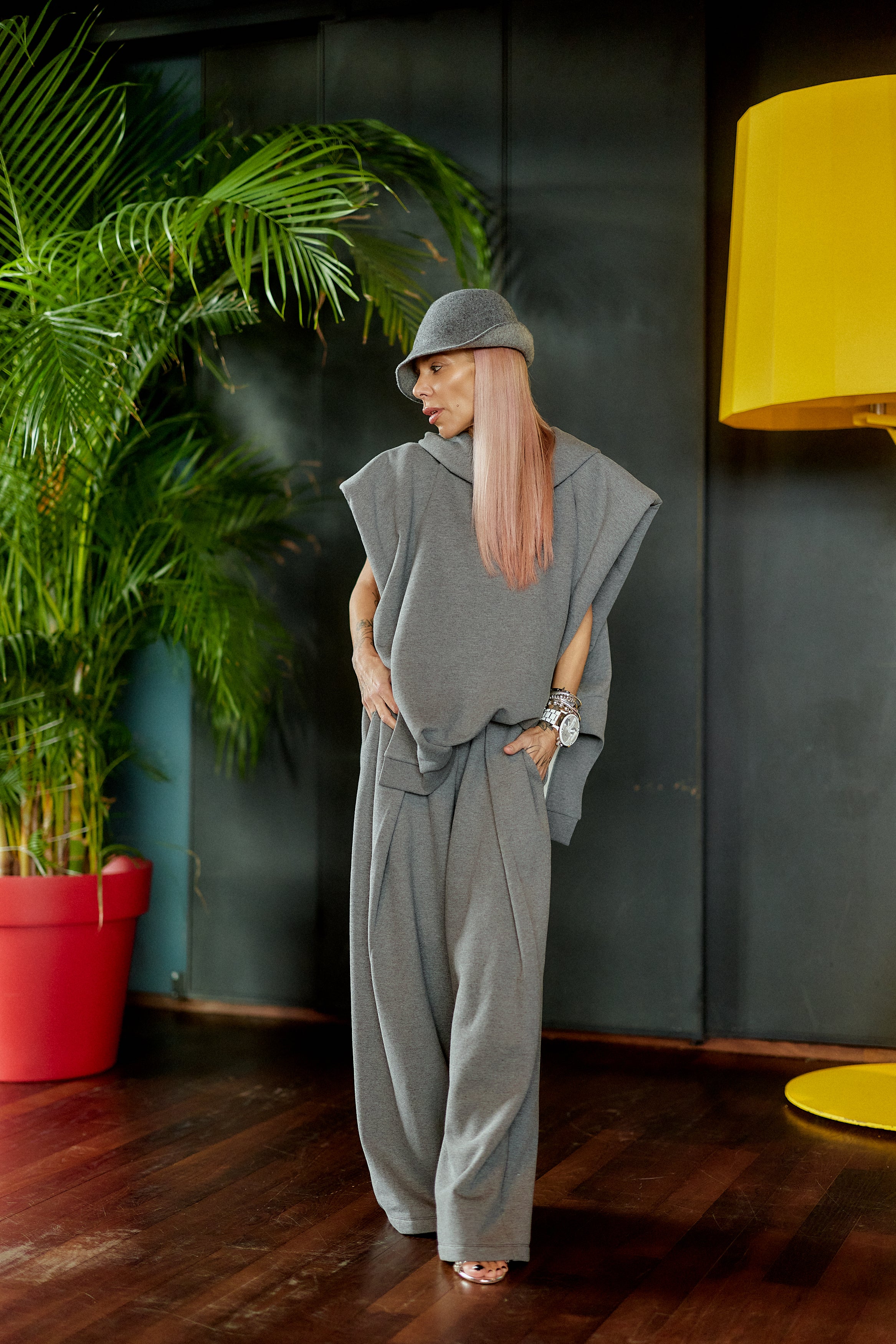 This two-piece set is designed for effortless confidence and modern comfort. The oversized sleeveless hoodie top creates a strong, architectural silhouette, while the wide-leg pants add fluid movement and balance. Crafted in a soft, structured fabric, the set feels relaxed yet intentional—made for women who prefer presence over decoration. It works as a complete statement look, not as separates pretending to belong together.