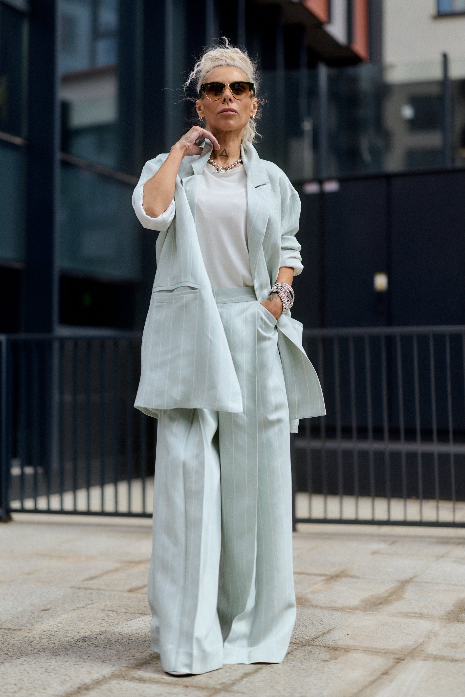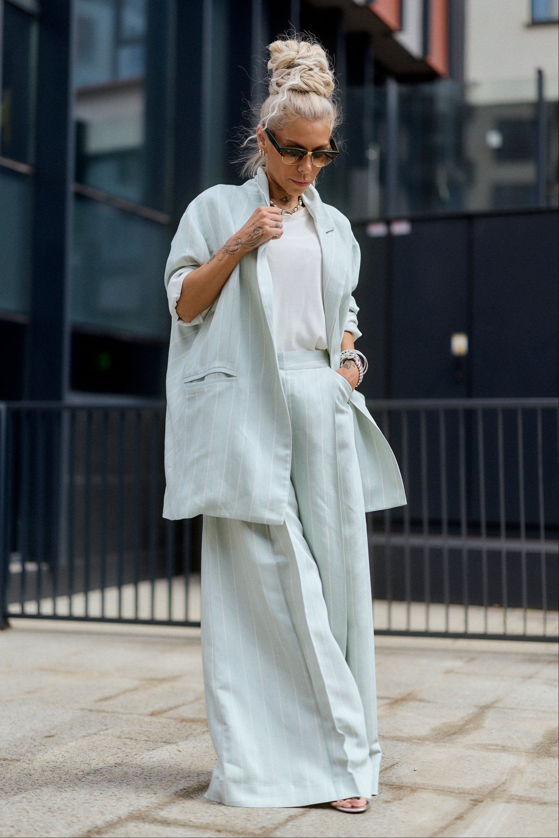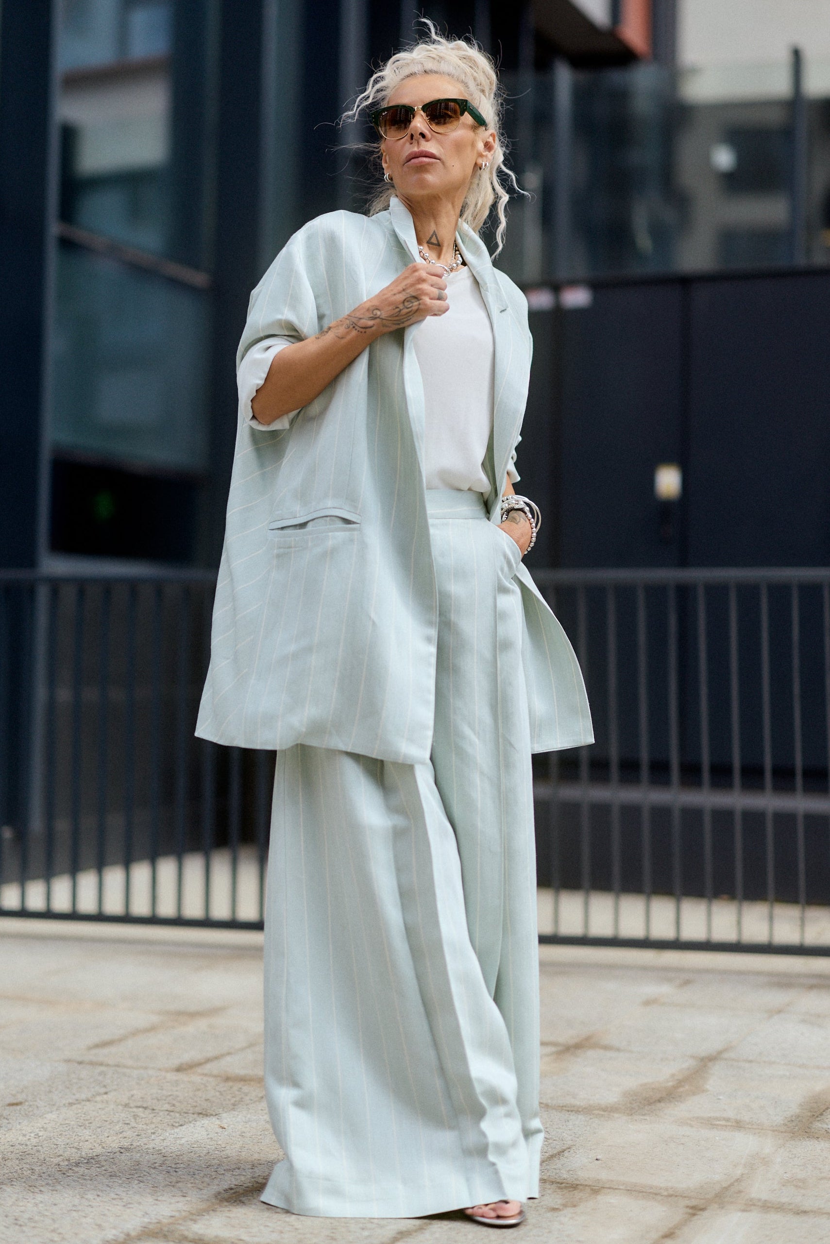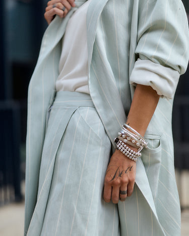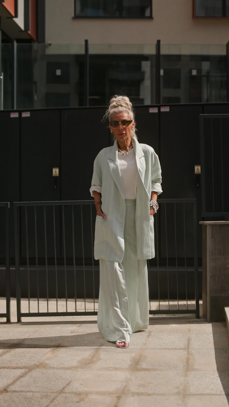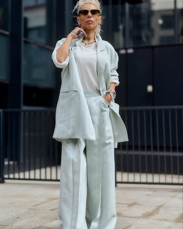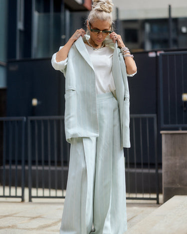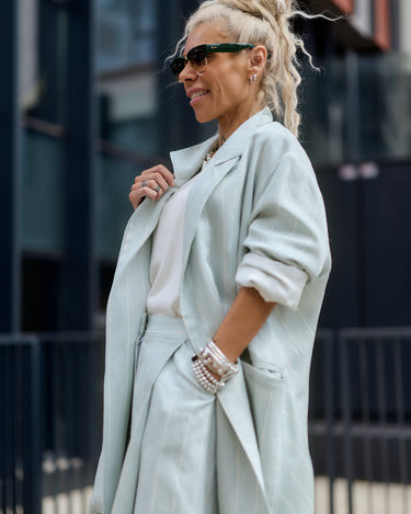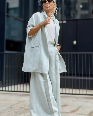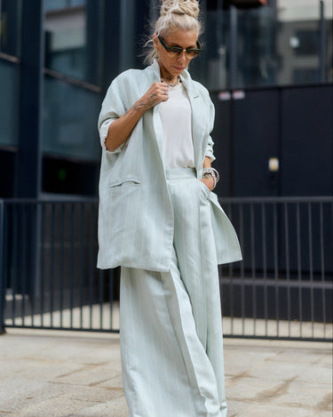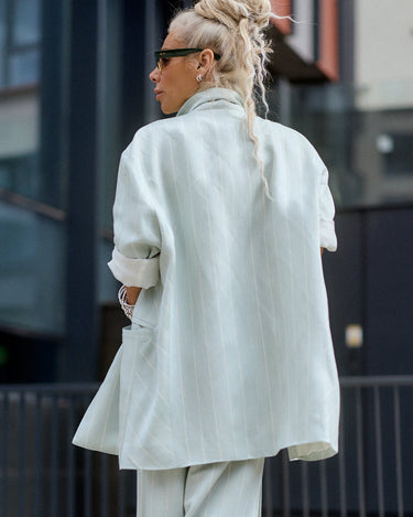 A relaxed-fit blazer in a soft mint shade with fine vertical pinstripes. The cut is loose and slightly extended, designed for layering without losing structure.