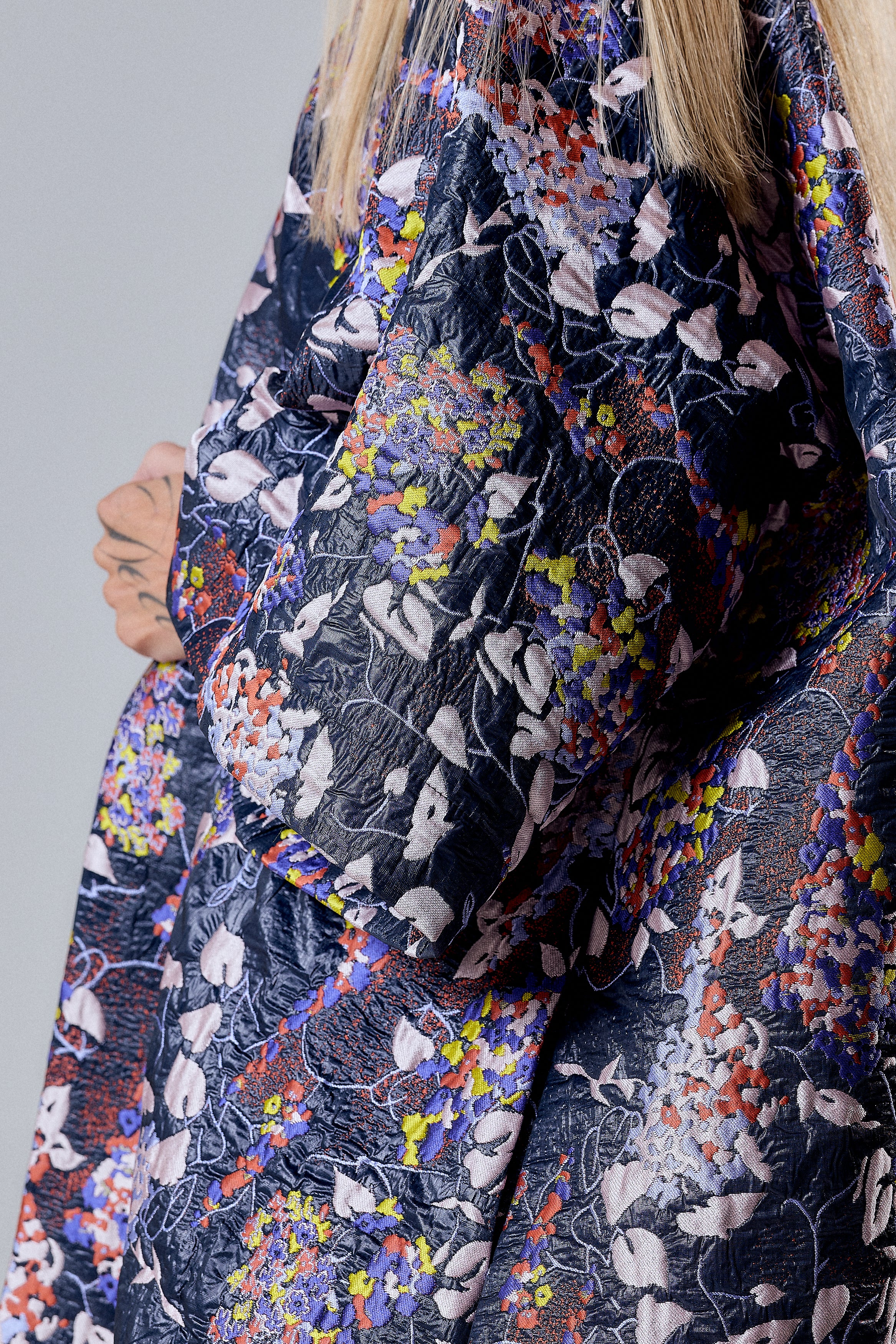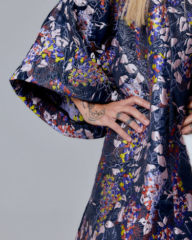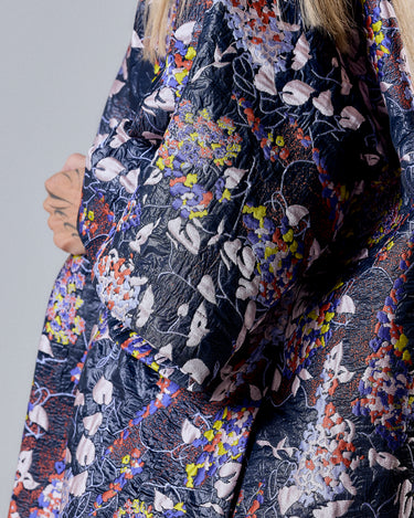 An avant-garde outerwear piece that commands attention — this oversized kimono coat redefines modern luxury with a bold floral tapestry print. Crafted from textured jacquard fabric, it drapes effortlessly while maintaining a sculptural silhouette. The voluminous sleeves and loose, flowing cut evoke both comfort and couture precision.