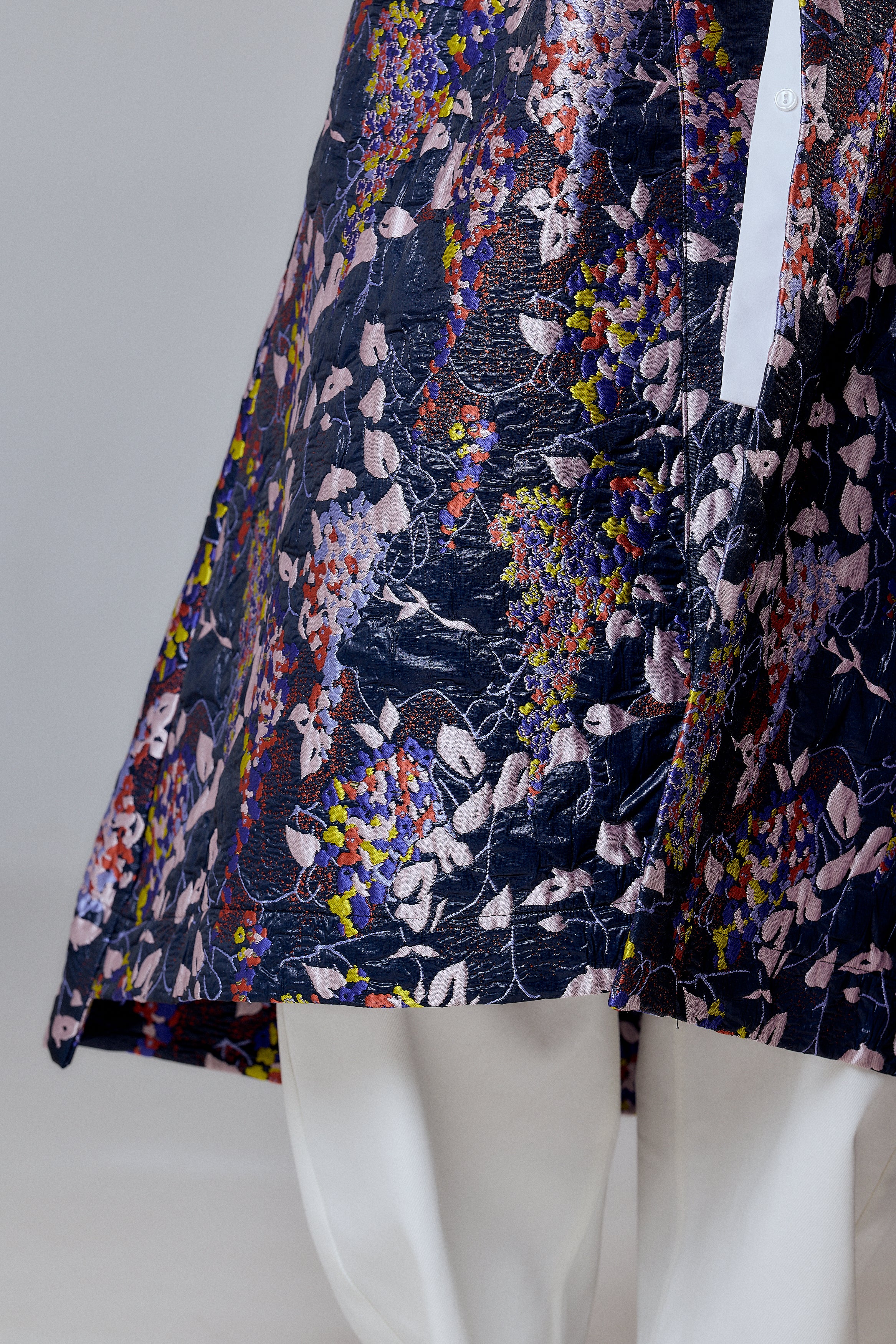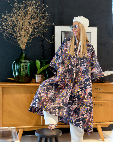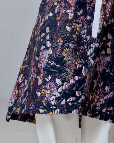 Its dark base contrasts with vibrant botanical patterns in shades of lilac, mustard, coral, and ivory — creating a visual composition that feels like wearable art. Designed with side pockets and hidden button closure, it’s an ideal layering statement for transitional seasons.