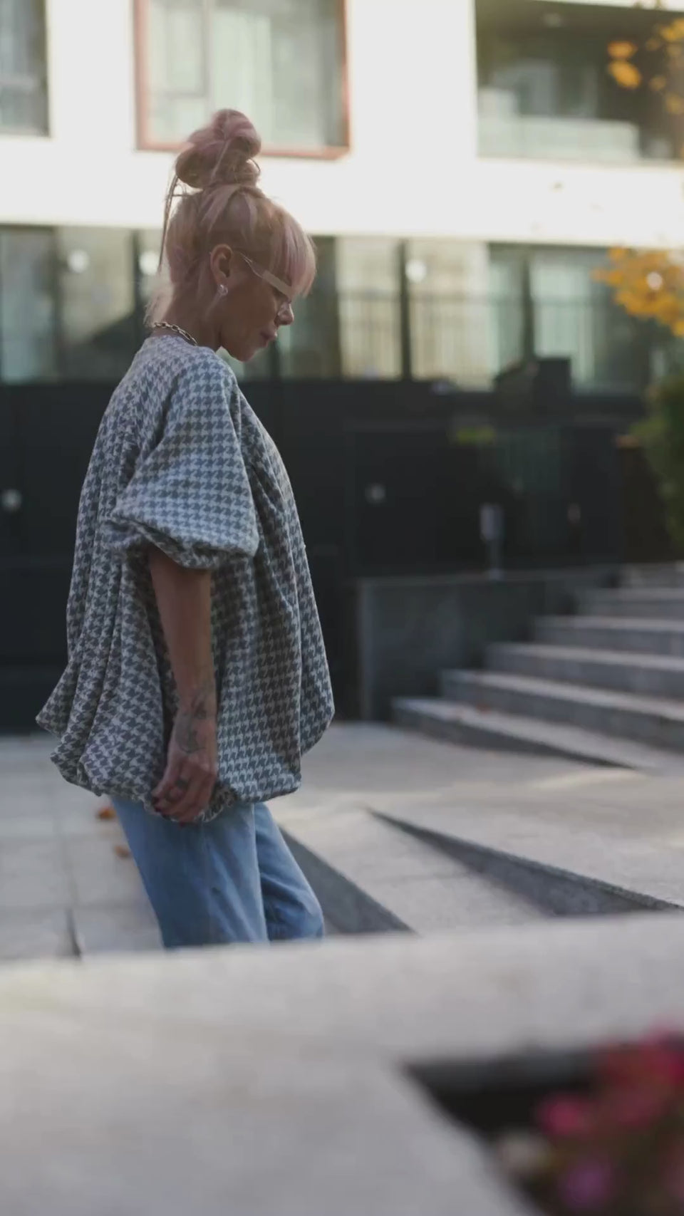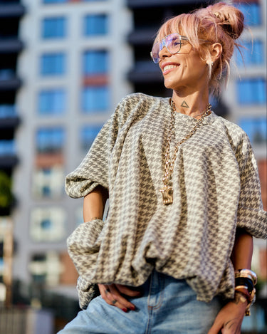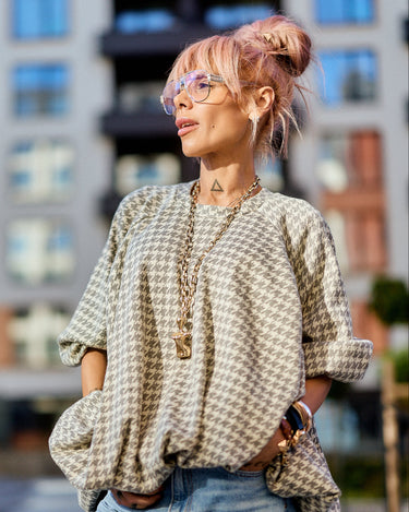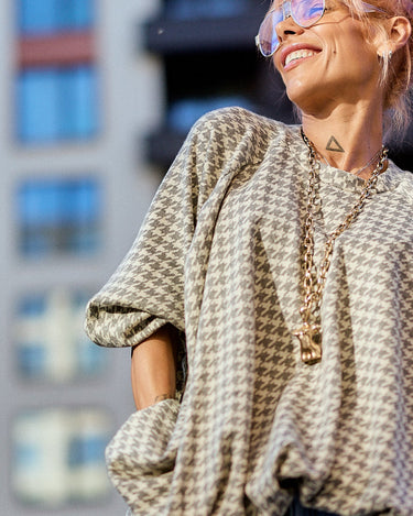 The Oversized Sweater fuses timeless sophistication with an urban oversized silhouette. Crafted from soft textured fabric in a modern beige-and-grey houndstooth pattern, it’s designed for effortless impact — relaxed yet commanding.