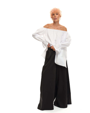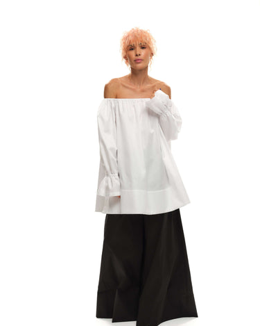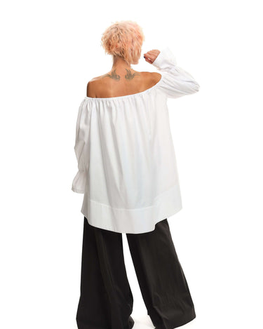 Long off-the-shoulder top with an elastic collar and gathered cuffs.