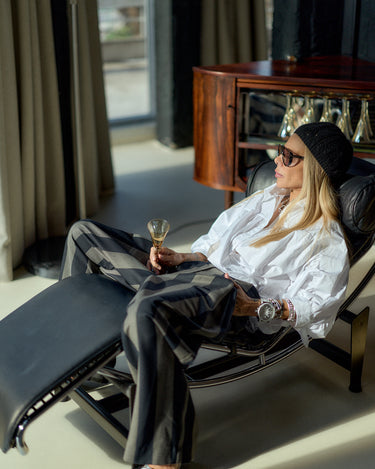 Pair with an oversized white shirt for timeless sophistication, or style with a fitted black turtleneck and heels for a dramatic evening effect. Add chunky silver jewelry or a statement watch to echo the graphic geometry of the stripes.